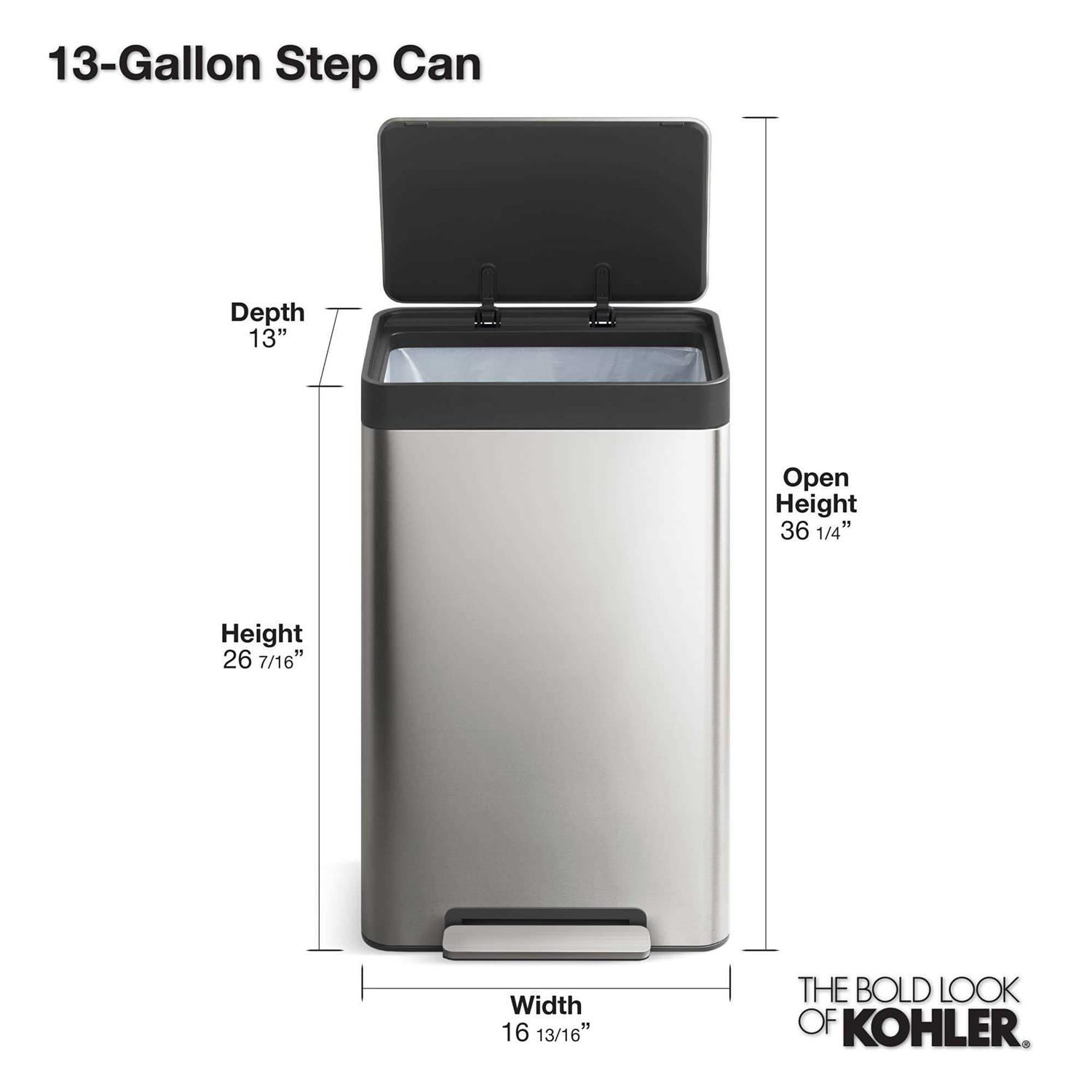 Designed to fit any brand of 13-gallon trash bags Fingerprint-proof finish stays cleaner longer Hands-free operation with durable metal foot pedal Raised liner and locking rim for easy bag changes Quiet-close lid closes gently and silently Space-saving profile fits snugly against wall or cabinets Hinge design protects wall from scuffs Removable plastic liner is easy to clean Available in Stainless Steel or black Stainless Steel For regular cleaning, use a damp microfiber cloth. Do not use cleaners or abrasives. To remove sticker adhesive, use isopropyl (rubbing) alcohol. Crafted with thoughtful details and smart functionality, the Kohler step can collection will simplify your daily routine at home and meet the style demands of its surroundings. This 13-gallon rectangular step can has been designed to fit any brand of 13-gallon trash bags. It opens with a sturdy foot pedal, allowing for hands-free operation. The trash can has an efficient footprint with clean lines and flush features, so it can be placed right against the wall or cabinet. A raised liner and rim-lock make bag changes easy, and the fingerprint-proof finish stays cleaner longer. For regular cleaning, use a damp microfiber cloth. Do not use cleaners or abrasives. To remove sticker adhesive, use isopropyl (rubbing) alcohol.
