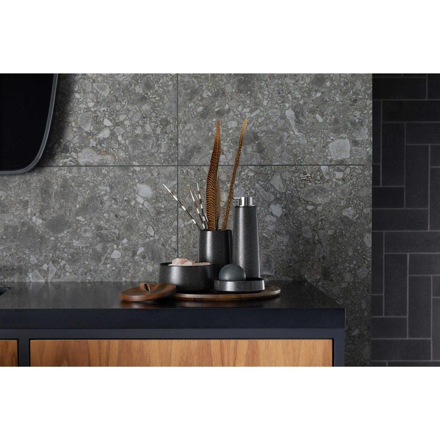 Kohler This five-piece set includes a ceramic soap dispenser, tumbler, lidded canister, soap dish, and a wooden tray. Each piece was thoughtfully designed to nest together on the wooden tray or be used individually in a multitude of spaces throughout the home. Unique material elements and finishes are beautifully incorporated into the collection. The pattern celebrates the subtle colouring and distinctive pebbled texture of natural shark and ray leather.