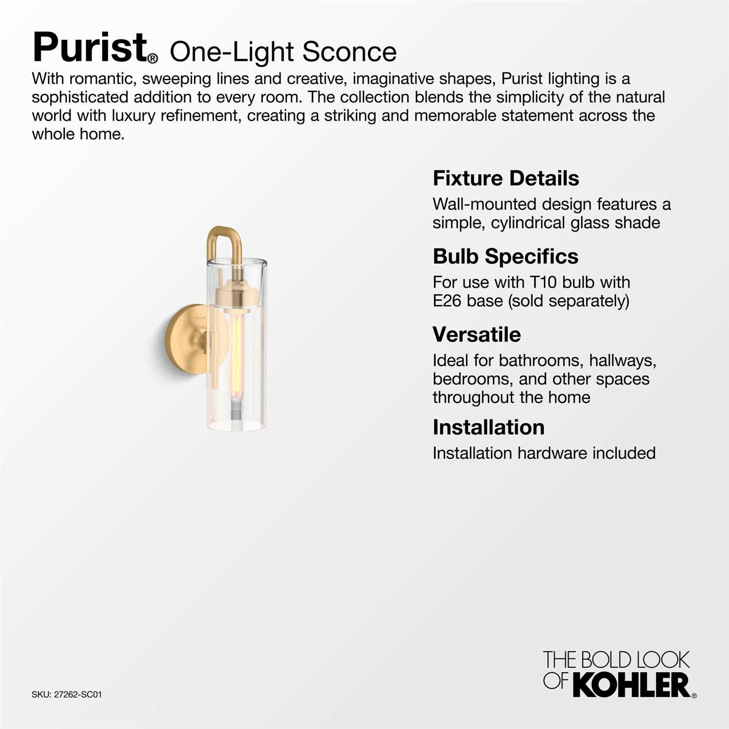 The sleek lines and modern design of Purist lighting complement contemporary home decor. Minimalist sconces, pendants, and linear chandeliers provide a soft, inviting warmth, reflecting elegant simplicity. Available in an array of finishes, these versatile fixtures were created to complement the KOHLER Purist faucet collection for a cohesive home design. Rounded glass shades connect with tube attachments and metal bases in contemporary designs fit for any room. Coordinates with faucets and accessories in the Purist collection. Requires bulb with medium (E26) base; type T bulb recommended (sold separately). Suitable for damp locations, per UL 1598.