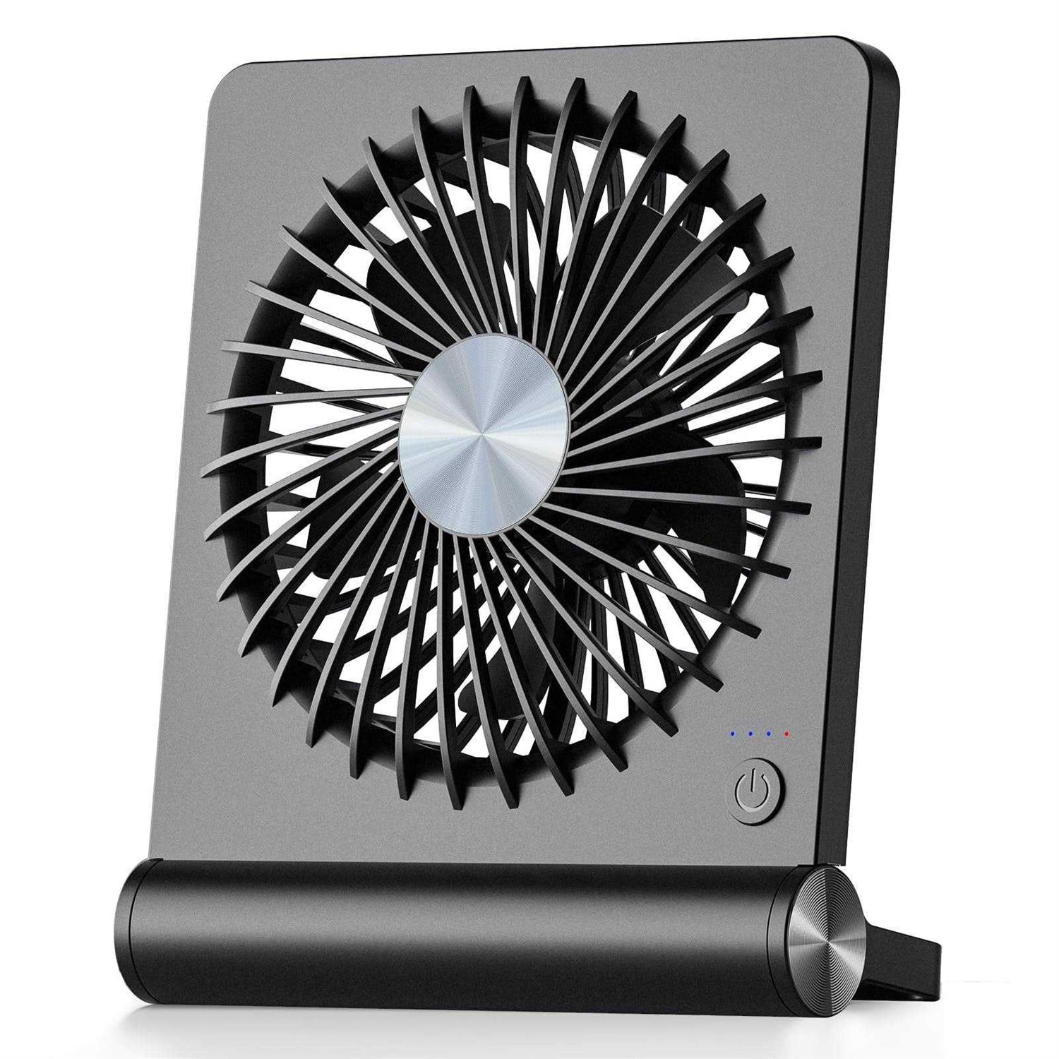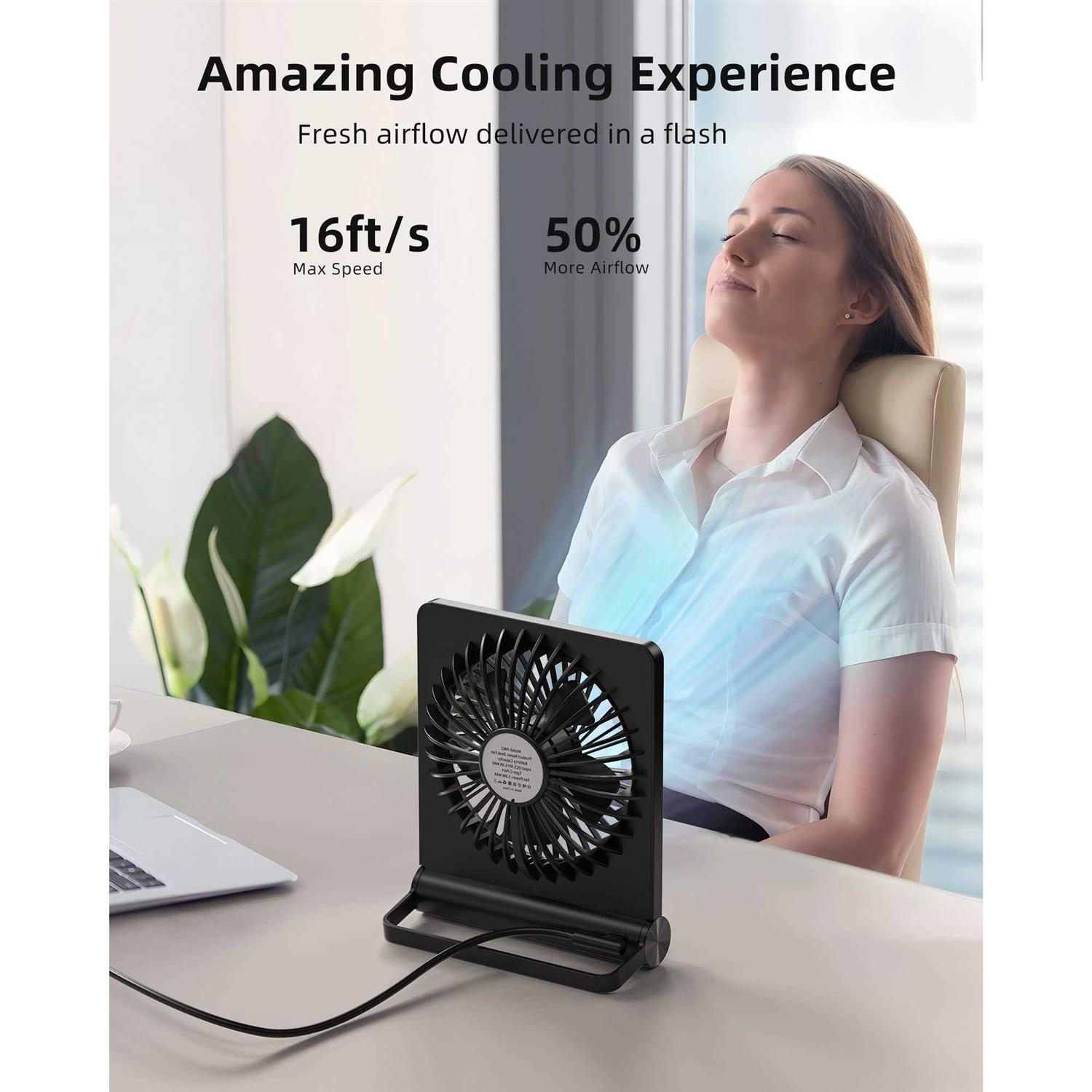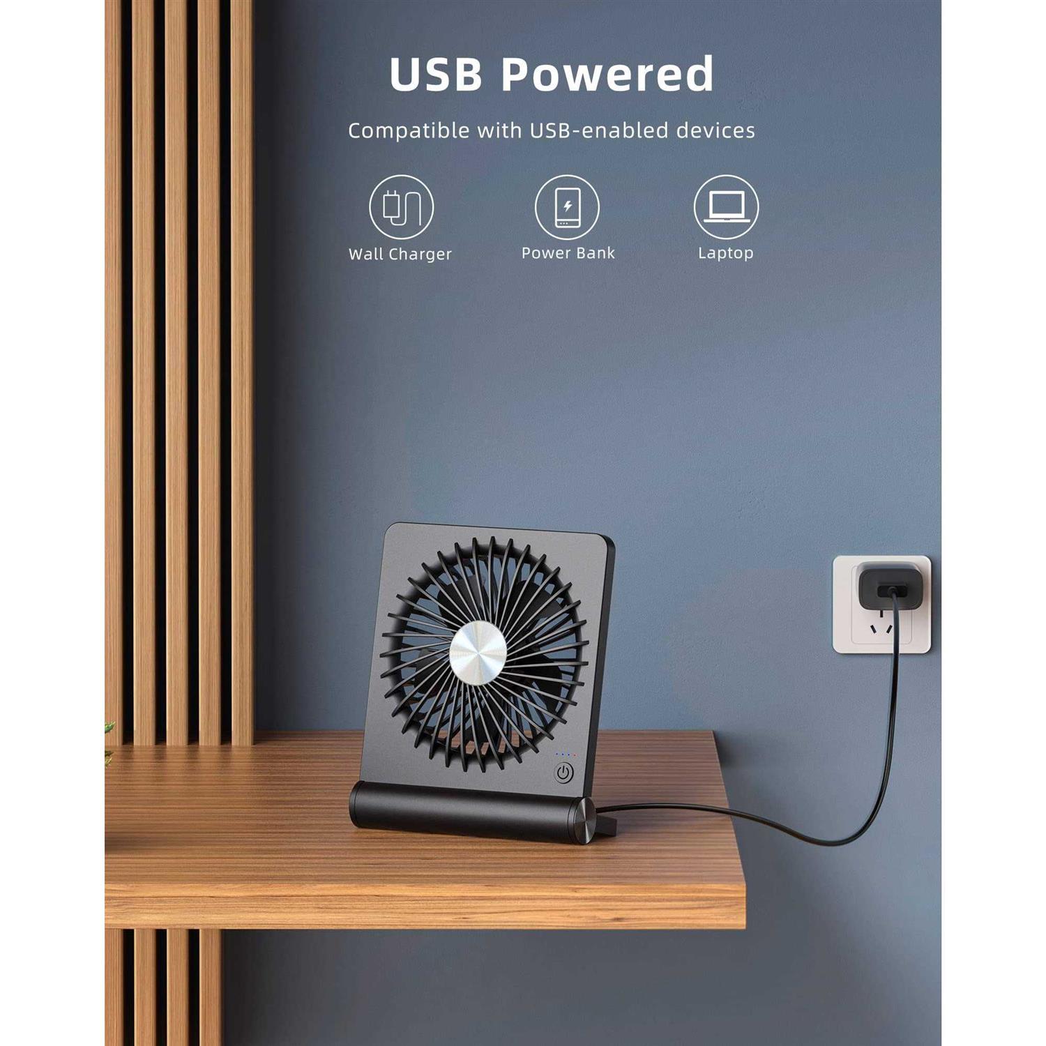 Koonie USB Fan, Strong Wind Ultra Quiet Small Desk Fan 180° Tilt Folding 3 Speeds Adjustable USB-C Powered Personal Fan for Home Office Desktop Black Product Features Optimal Airflow The desk fan with upgraded DC motor generates airflow up to 16ft/s. 5 premium fan blades produce broader and more balanced airflow as comfort as mountain stream breeze, keeping you calm and cool during steep summers. Stylish & Space Saving As compact as a tablet, this real space-saving desk fan can be placed on the office desk or bedroom nightstand with utmost ease to save limited space. Slim and stylish, this fan will embellish your space to the next level. Personalized Cooling From soft breezes to strong winds, this tower fan offers 3 speed levels to cool your body and soothe your mind whenever you need it. You can always get the comfort just right for you. Quiet at all Speed Acoustically constructed airflow systems greatly decrease motor and fan noise down to 30dB. This compact desk fan also adopts aerospace fluid dynamics technology to provide ultra quiet cooling at all speeds. Sturdy yet Stable The triangle-shaped structure and rubber pads will achieve better stability to keep the fan in place at all times. 220pivoting fan casts cool breeze to wherever you want for optimized and efficient performance.