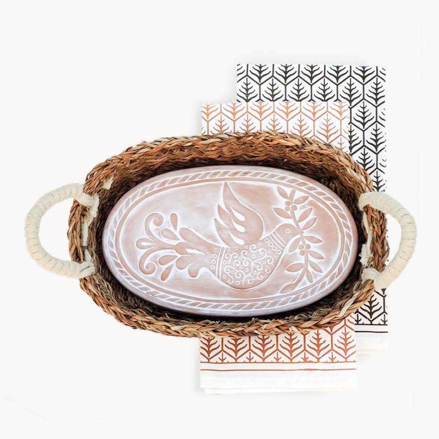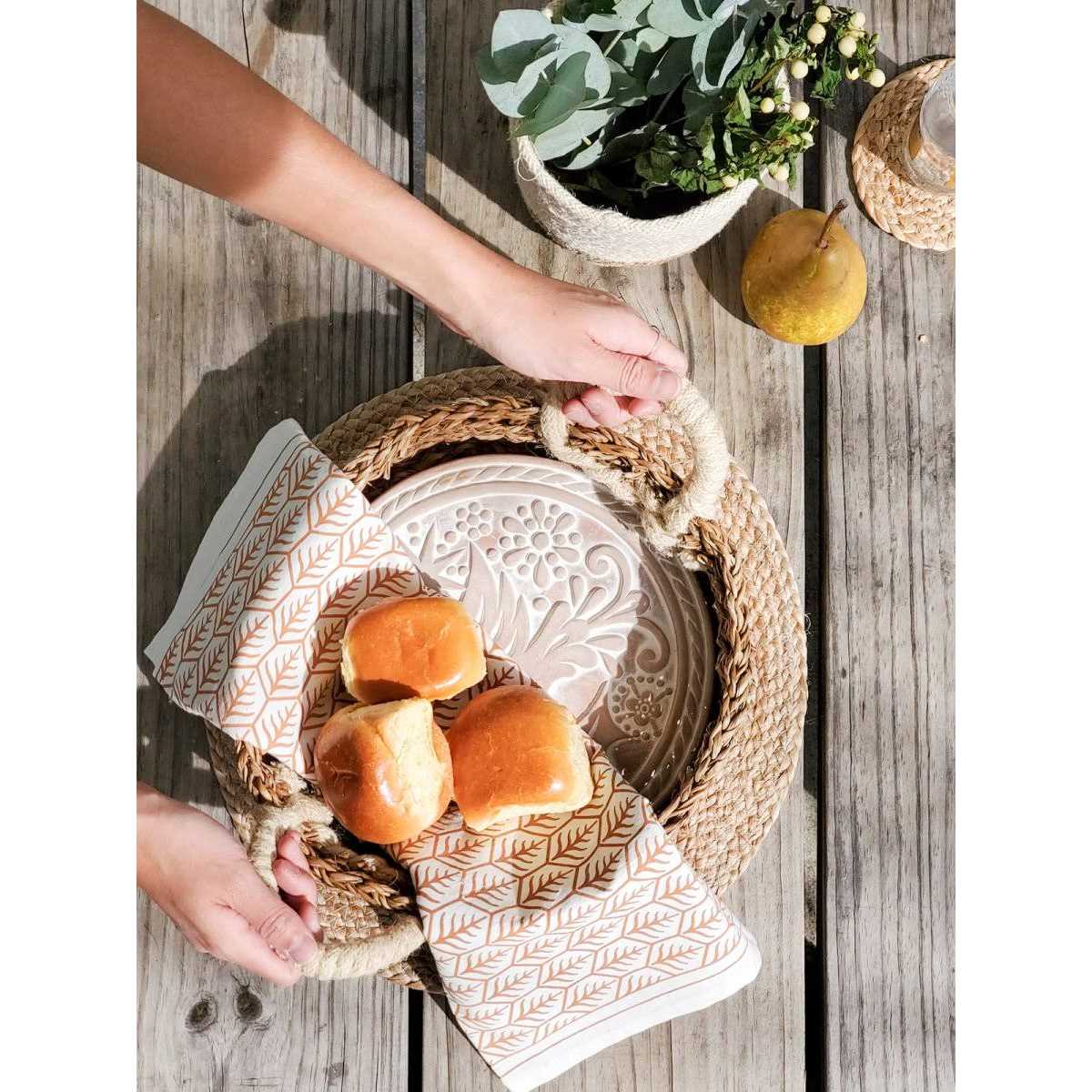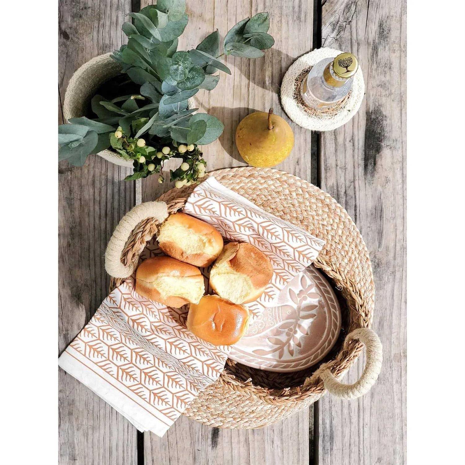 Add a bit of artisan-inspired style to the kitchen with a terracotta bread warmer and hand screen printed tea towel. Engraved with a bird &and leaf design and cut to fit neatly into an oval basket, this terracotta special bread warmer is naturally insulating, and the basket itself has been handwoven from sustainably grown seagrass. The tea towel is great for drying dishes or hands in the kitchen, lining a bread basket. They are the best gift items for anyone who loves bread! Included items, (1) Terracotta Bread warmer, (1) Seagrass basket and (1) Tea towel of your choice. Each product is sustainably handmade by Fair Trade artisans in Bangladesh.