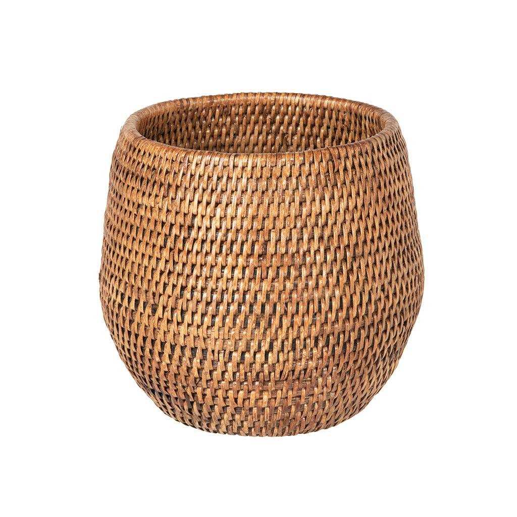 Overall diameter 7.5 inches x 7 inches high. Diameter opening 5.5 inches. Hand crafted fom naturally grown Rattan. Holds 5 inch pot Cleans with damp cloth.