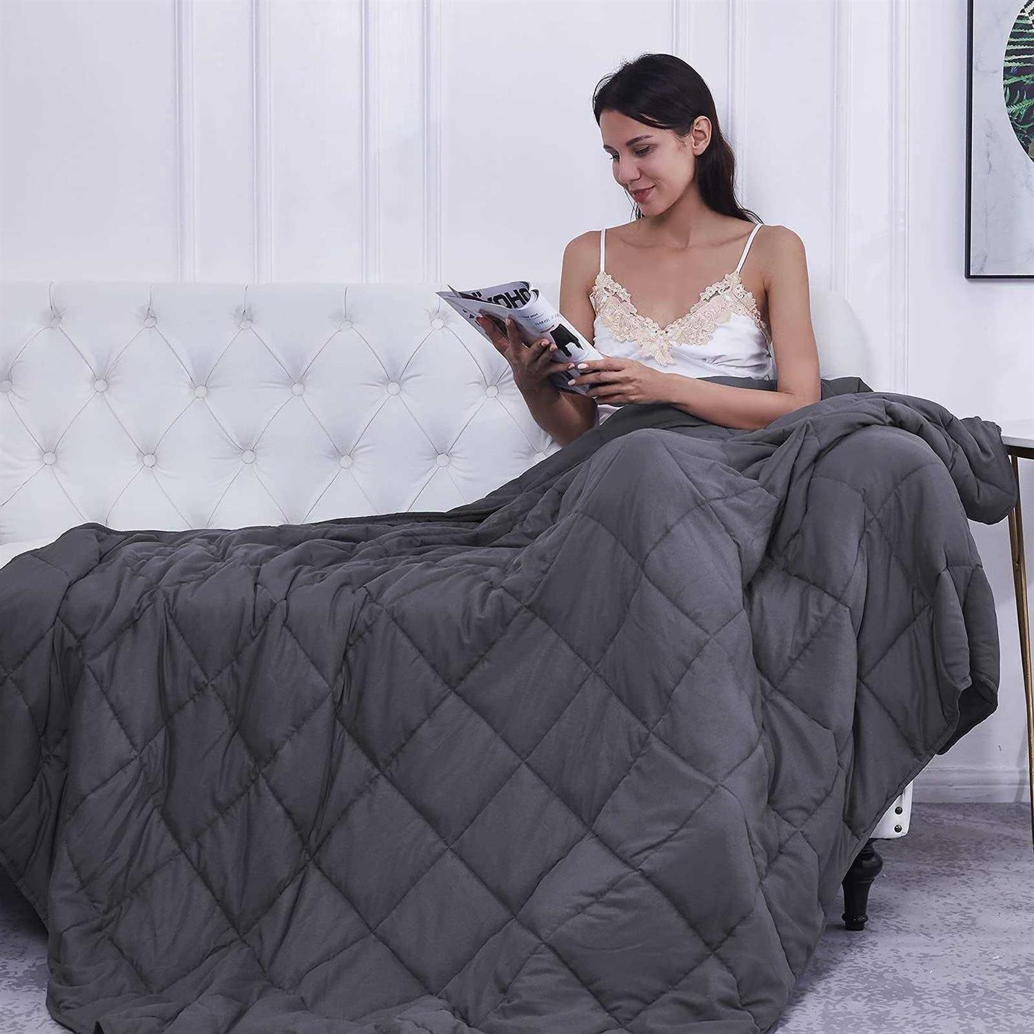 【PREMIUM MATERIAL】 – The weighted blanket is made of soft breathable microfiber material and filled with 0.8-1 mm non-toxic hypo-allergenic glass beads. This blanket could providing a cooling sensation in the summer & a breathable warmth in the winter. 【RECOMMENDED WEIGHT/SIZE】 – Please choose 7%-12% of your body weight, which would help you sleep better and faster. This weighted throw blanket not only can be used at sleep, but also can be used while reading, relaxing, or meditating. This tool makes the beads evenly distributed in the blanket. 【ABOUT SIZE】-Weighted Blanket is much smaller than ordinary blanket, because it is supposed to concentrate the weight on human body so the weighted blanket would not hang over the edge of your bed. Remember, if it is the first time to use a weighted blanket, it usually takes about a week to adjust to the weight of the blanket. 【EASY CARE】- Hand wash and hang dry is the best way for cleaning. 【REMINDER】-The Weighted blanket is not recommend under 3 years old and pregnant Women,and do not cover your face with the blanket. So what can you do to help adapt to a weighted blanket? /b br 1. A weighted calming blanket is more heavy than normal blanket. If you choose a fit size and weight based on your weight, Please give 7-10 days to adapt to this weight. br 2. You could put parts of body under the blanket during the first day if you were a begianner. Mostly covering your waist and hip, avoiding shoulders, calves. br 3. When you adjust to the blanket gradually, you could cover the whole body. br 4. After fully adapting to the weighted blanket, it could be used with other duvet together for keeping warm in the cold winter. br br br Reminder: /b br 1. Recommend hand wash. Weighted blanket is washable,but frequent machine wash may damage the heavy weighted blanket . br 2. Weighted hug blanket uses breathable fabric , which is suitable for all seasons. But due to its weight it may also feel hot, so a fan or an AC is recommended. br 3. A weighted swaddle blanket would smaller than other ordinary blanket , which could help to concentrate the weight on your body. br 4. The Weighted blanket is not recommend under 3 years old and pregnant Women,and do not cover your face with the blanket. br 5. If you have weak or sensitive joints (knee, hip, back or joint pain), please avoid using. br 6. Keep clear of fires, heaters, or any other heat sources. br 7. People with health risks should consult your doctor before using weighted blankets. br