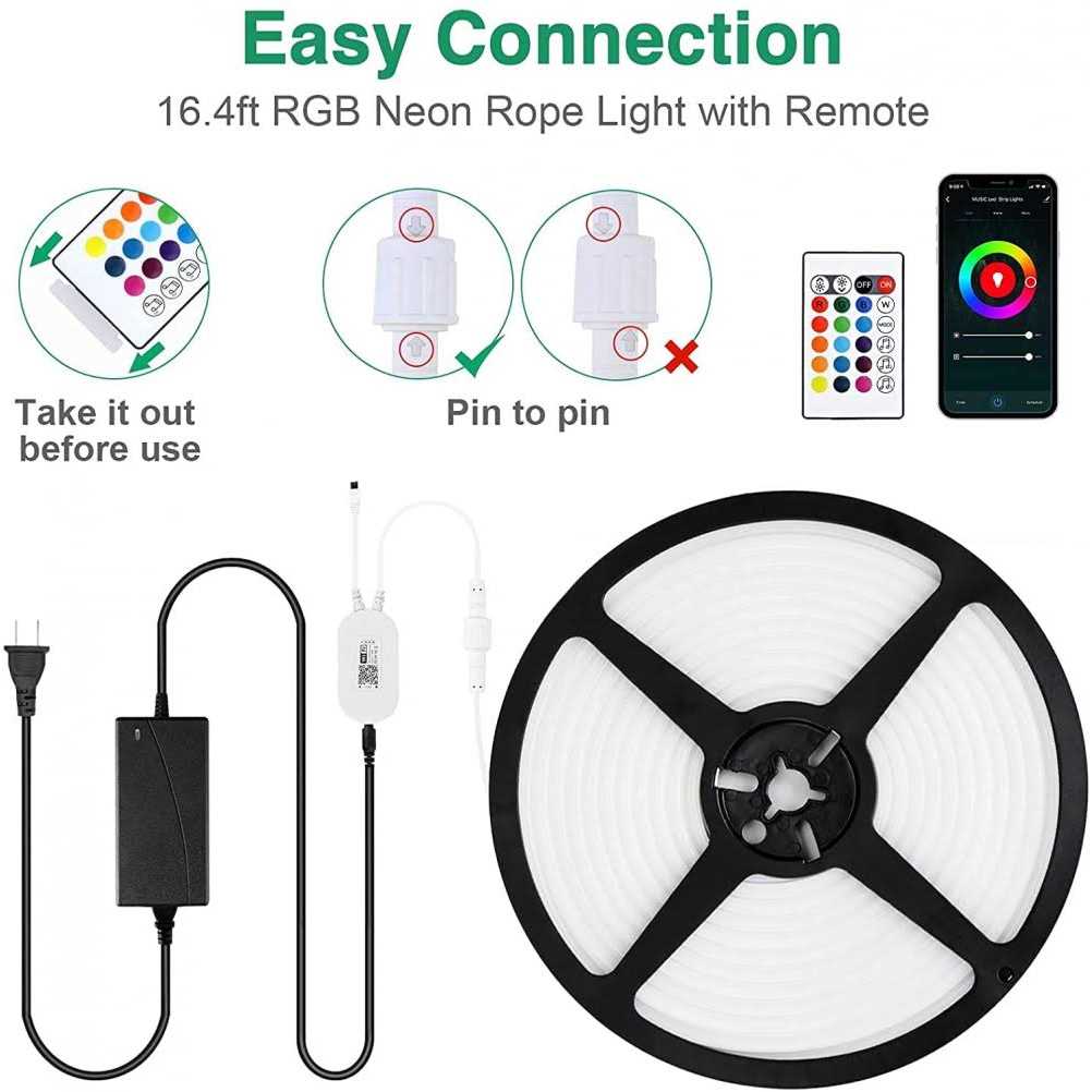12V Rgb Led Light Strip,Flexible Led Strip Lights Ip65 Waterproof Cuttable Led More Even Brightness Upgraded Silicone LED Strips Light and Side-Brightness Design Shine Brighter than others, 120 Degrees Projection Range offers Large Illumination Coverage, and the Light is very even down the Rope Strip. Safer Silicone Material, Wont be Self-ignited even Burned with fire; LED wont die out. This Flexible LED Neon Rope Light Works with 12V Direct Current which Makes it Low Heat. So it is Touchable for Kids and Adults. 3 Way Smart Controls3 ways: Phone app controlled with Bluetooth or WiFi connection, the colored lights can be wireless controlled without distance limit even when you are away from home(PRESS THE WHITE OPEN BUTTON TILL THE LED NEON TURN RED, THEN YOU COULD SCAN THE CODE AND CONNENT THE PHONE APP.) Take Control by Voice LED strip light works with Alexa and Google assistant via simple voice control. Use simply conversations like “turn on/off light”, “dim/brighten light” to control. Music sync & Timer function Built-in sensitivity adjustable microphone, rope lights color will change with the the rhythm of the sound and music.create a romantic,gorgeous, interesting,magical atmosphere for your party. Schedule your light strip to turn on or off at specific time. Wake up to vibrant colors. Have your lights dim or turn off automatically during movie time to set up the right ambiance. Easy Installation & Cuttable Complete Light strip kit Including 1 reel of 16.4ft RGB light strips, an AC Power Adapter, 24-KEY IR remote Control, a controller, an Instruction Manual, Led strip lights Installation Accessories(4-Pin Connectors, Gapless Connectors, 5 support clips, and screws). Flexible to install anywhere you want. The LED lights can be easily cut, which can be cut every 3 LEDs along with the cutting marks, customize the length of the led lights. Widely used Color Changing neon rope lights can be better used as decorative lights for yard, house, RV, kitchen, bedroom, bar, office building, party, play computer games, outdoor, etc., creating romance atmosphere on Halloween, Christmas, and Valentine’s Day.please Check B09H5VZK39 for more holders.