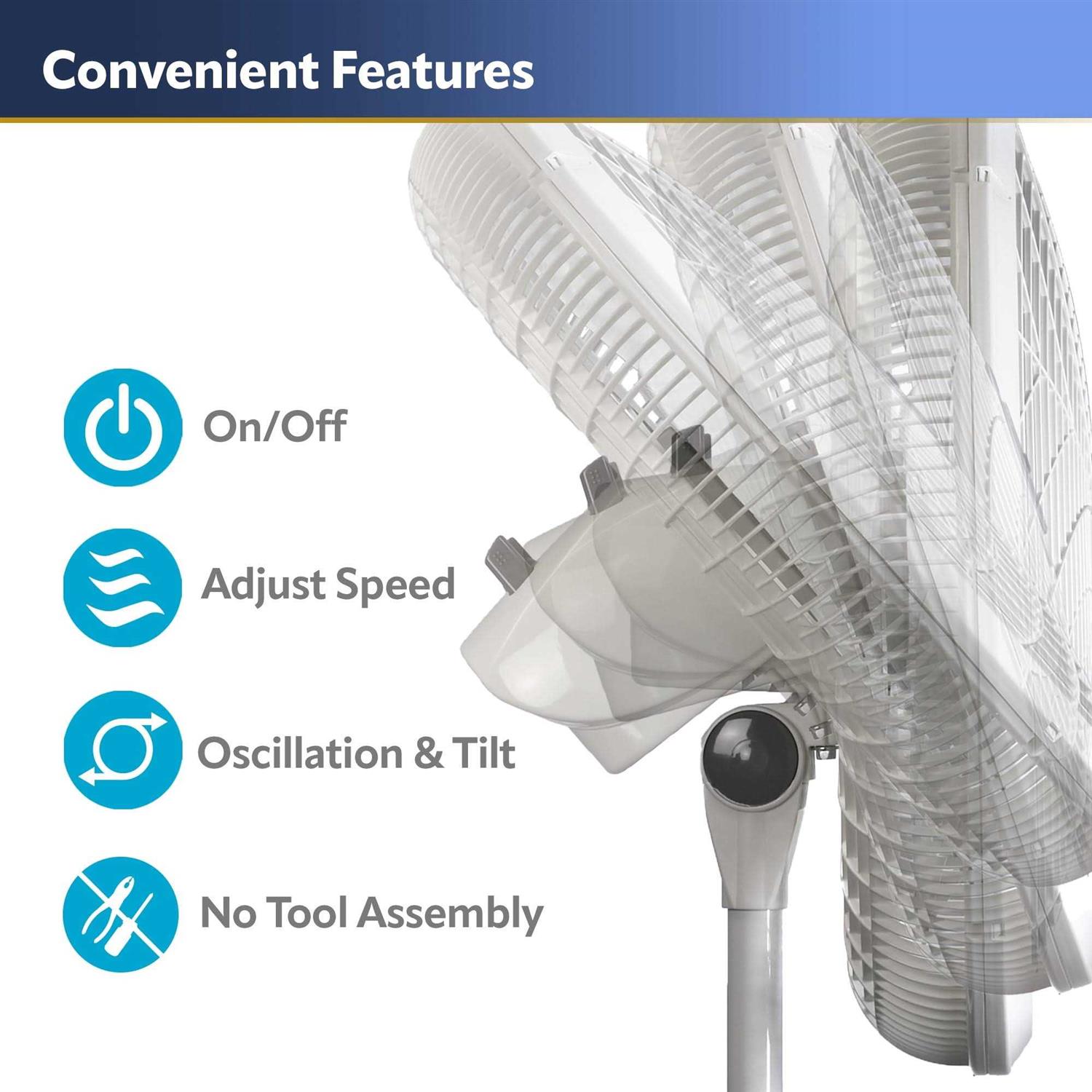 Say goodbye to warm dry air and hello to cool air with the Lasko Elegance and Performance 18-Inch Pedestal Fan. Whether you re unloading the furniture into your new home typing away at an office or need a little extra circulation inside a newly constructed home this 3-speed indoor fan has all the cooling power you need to fill up your space and create a more comfortable working or living environment indoors. Our favorite feature of this standing fan is its adjustable base. Whether you need some extra air circulation down low or up high you can adjust this fan from 38 to 54.5 inches in height. In addition to its customizable height this fan also has 3 fan speeds so you can adjust your air movement to exactly how you want it in your room. Luckily this fan is also energy-efficient and quiet so you won t wake the neighbors or butcher your electrical bill either. The 18-inch blade is enclosed with a surrounding guard and the frame is built with durable materials so the structure of the fan won t be damaged by the occasional bump or bruise made by running into or other occurrences found in the home and garage. Built with plastic construction this pedestal fan is built with durability in mind to last you through many cooling sessions. Best of all this indoor fan features an elegant grill design that blends into surrounding decor furniture and other indoor structures. With a stylish white design this 3-speed fan complements any space it is placed in while adding an elegant addition to any area. Work more efficiently and relax more peacefully in overheated spaces with a 3-speed fan that creates a cooler environment. Easy and straightforward this Elegance and Performance 18-Inch Pedestal Fan from Lasko might just be exactly what you need in your room big or small.