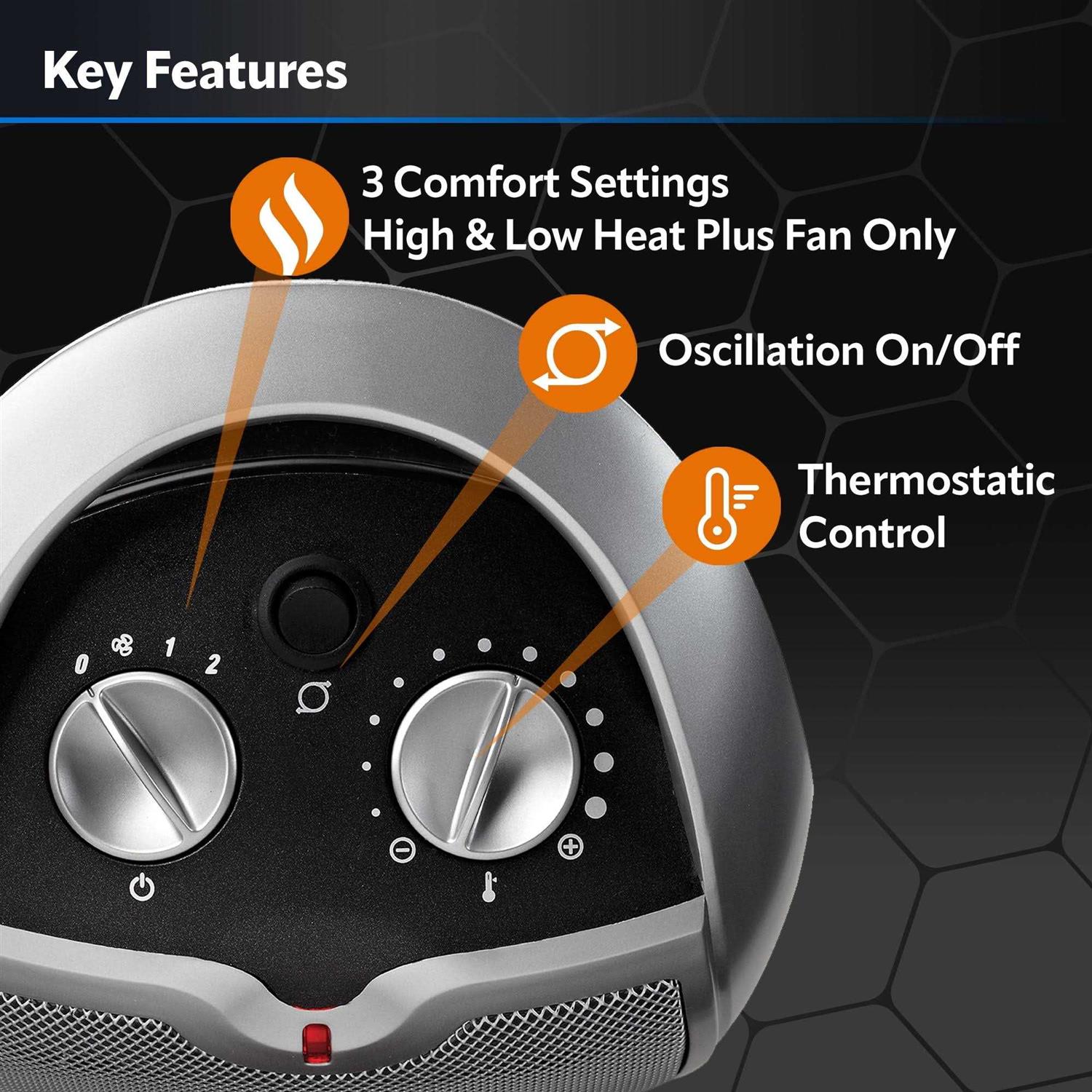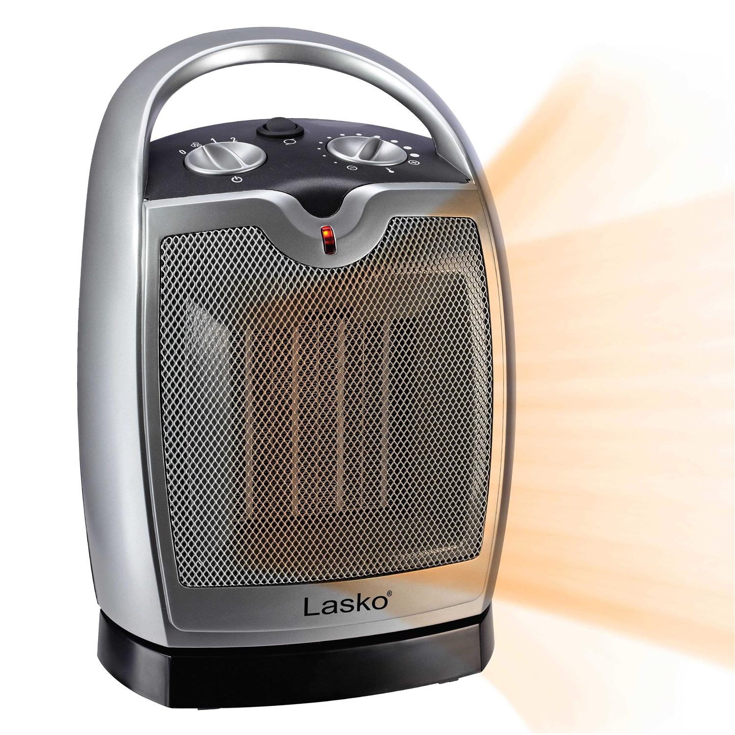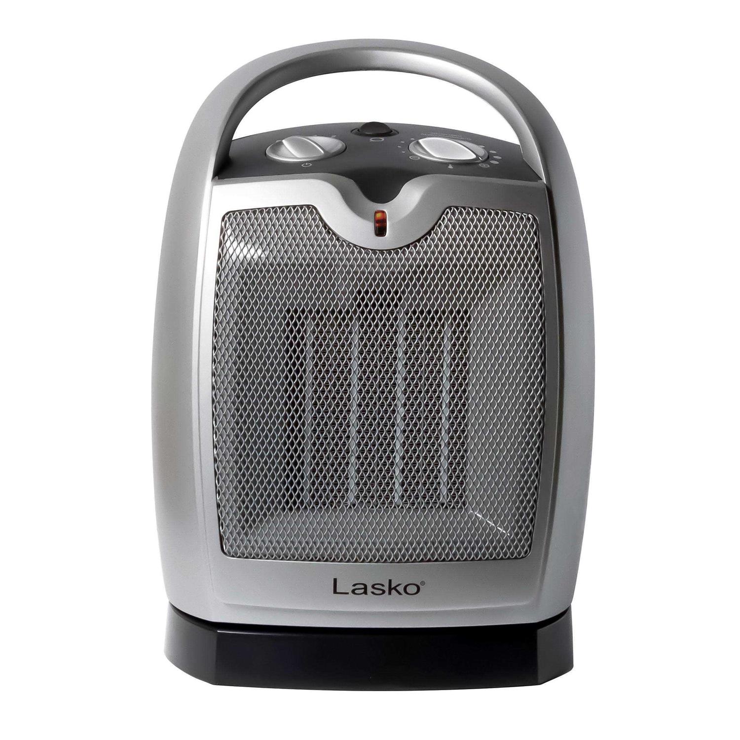 Enjoy comfortable warmth in your living space with this Lasko oscillating ceramic heater. The adjustable thermostat offers personalized heat control, and the oscillating design ensures improved air circulation for even heat distribution. This Lasko oscillating ceramic heater features overheat protection and a cool-touch exterior for enhanced safety, and a carry handle ensures secure and convenient portability. Heats an area up to 50 sq. ft. To keep you warm and comfortable when it’s cold outside. 1500W consumption For thorough heating power. Overheating protection and auto shut-off Help keep your home safe. 3 heat settings So you can choose how warm to keep the room. Adjustable thermostat Lets you choose the optimal temperature. Ceramic heating Delivers quick heat. Oscillation Encourages circulation of warm air to help eliminate cold spots in a room. Carry handle Makes relocating the heater simple.