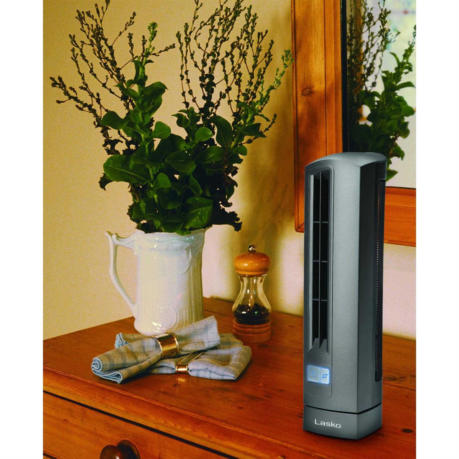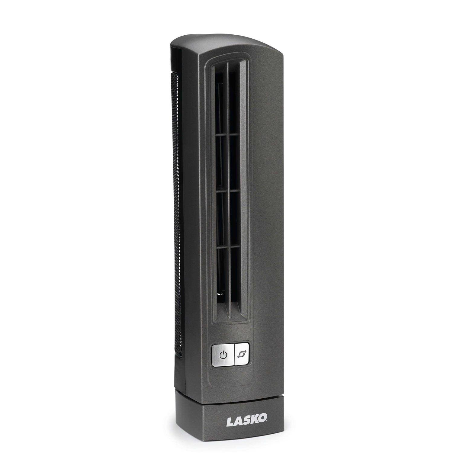 The Lasko Air Stik ultra-slim oscillating fan is a great little office companion. Fitting elegantly in any size space, this tall and slender tower fan has a stylish look. Quite powerful for its size, its two fan speeds deliver a refreshing breeze. Its electronic controls have a beautiful blue LED light illuminating its power and oscillation buttons. Safety features include a patented fused safety plug.