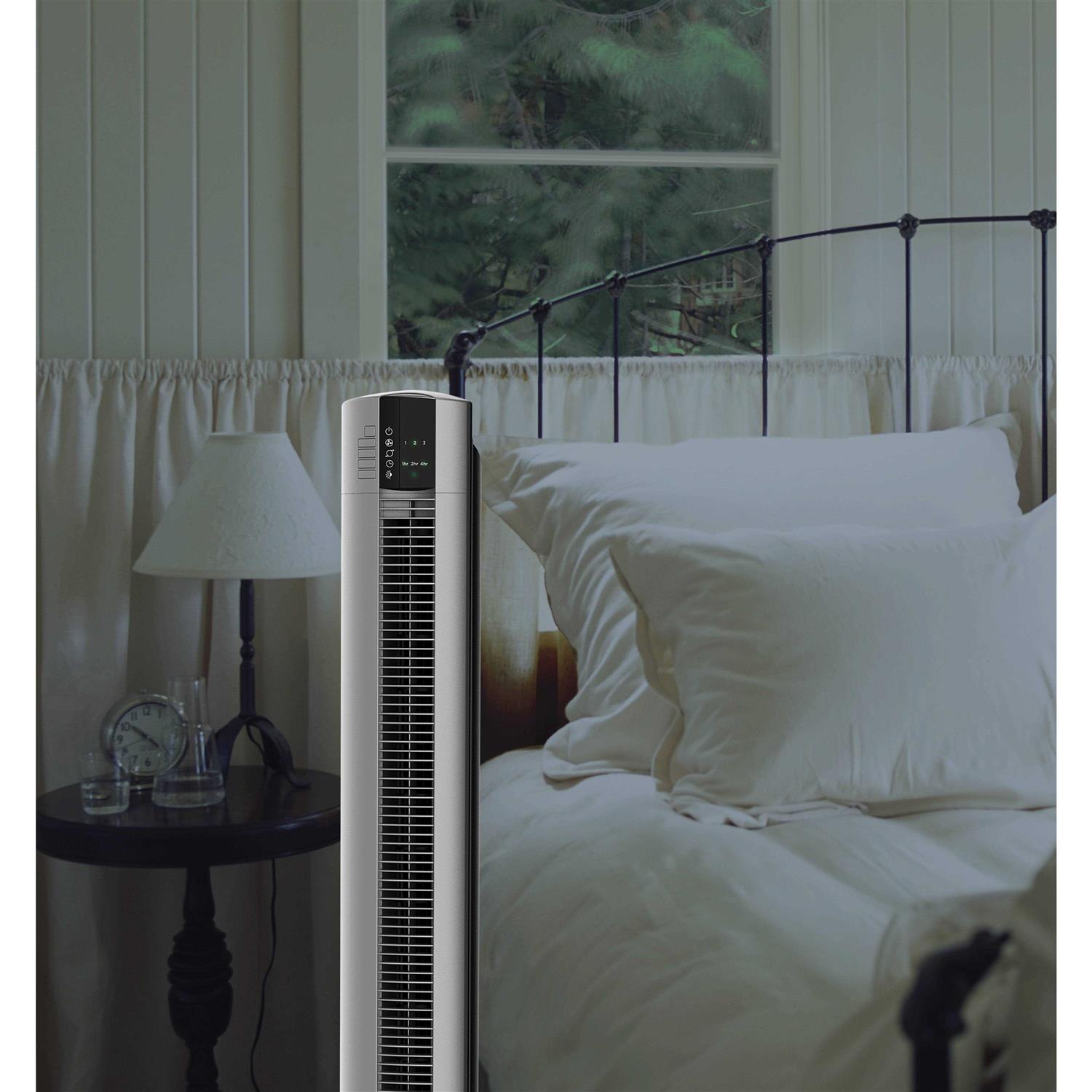 Pre-Owned The Lasko T48314 Tower Fan is 48′ tall with a black face and grey body. The sturdy plastic base assembles easily with a Philips-head screwdriver and occupies a 13′ x 13′ footprint on your floor. This sleek vertical space saving design allows you to put the fan in small places where other fans won’t fit without sacrificing air circulation and comfort. Powered by 3 quiet speed settings this fan helps you beat the heat. The fan delivers excellent air flow but is still quiet enough to hear the TV C even on HIGH. The fan creates just the right amount of white noise making it ideal for sleeping at night when it’s warm and stuffy. Perfectly sized to aim over a high bed and powerful enough to reach across the room. If you live in the heat with no central air and window units do a poor job of moving air around your home or apartment this fan creates excellent air flow and will help make you feel cooler. The fan is portable and easy to operate and comes with remote control optional oscillation programmable timer and a Nighttime Setting that automatically dims the control display and puts the fan on High for an hour then Medium for an hour and then stays on Low until you interact with the fan again. The remote is great for when you don’t feel like getting up to change the settings.