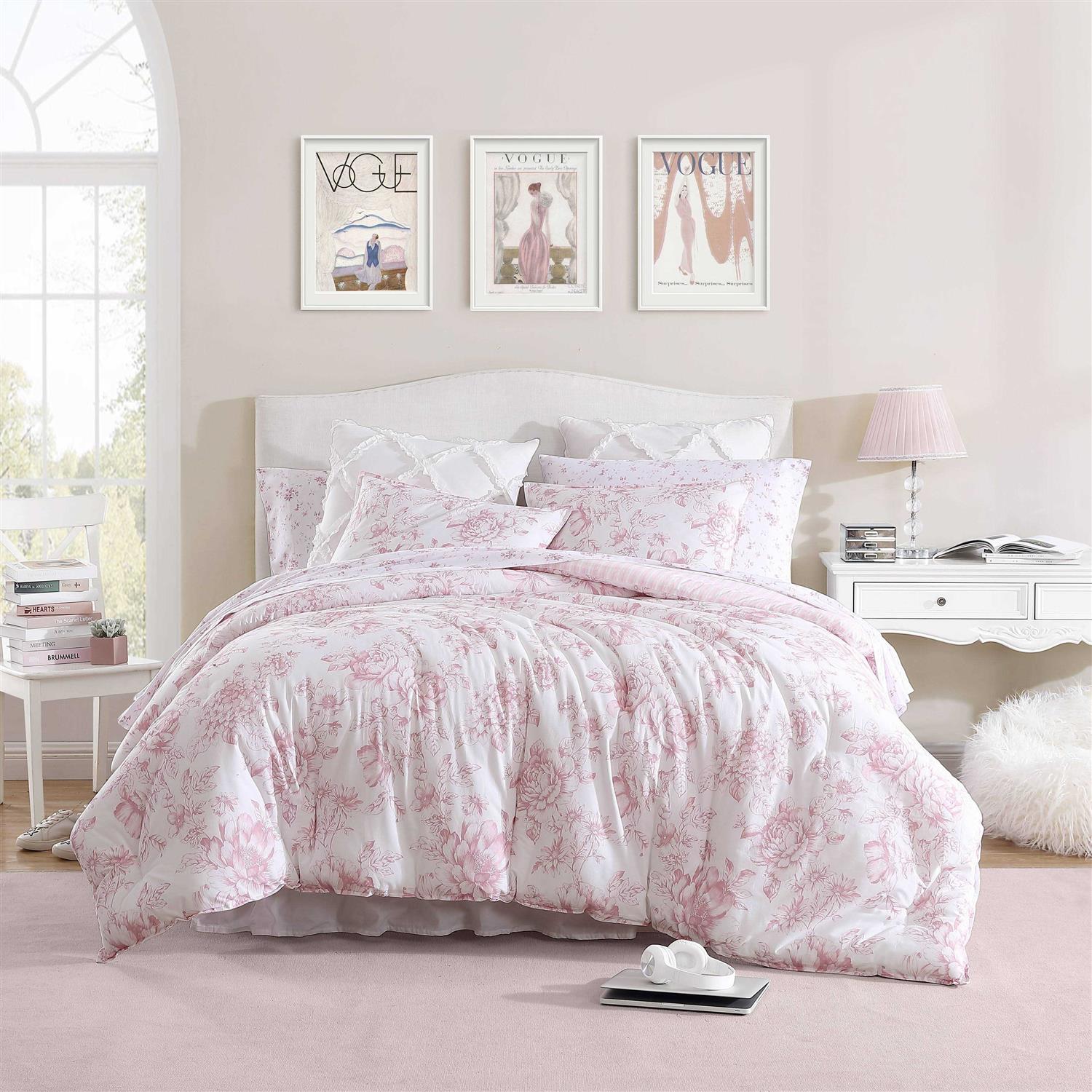 The Laura Ashley Delphine comforter set features stunning oversized floral blooms bursting in pink. This striking print reverses a traditional pink and white stripe on both the comforter and shams. Twin and twin xl 2 pc. Sets include a comforter and 1 standard sham; full/queen 3 pc. Set includes 1 Full/queen comforter and 2 standard shams; king 3 pc. The set includes 1 king comforter and 2 king shams. The ensemble is machine washable for easy care – for best results, use an extra large capacity washer.