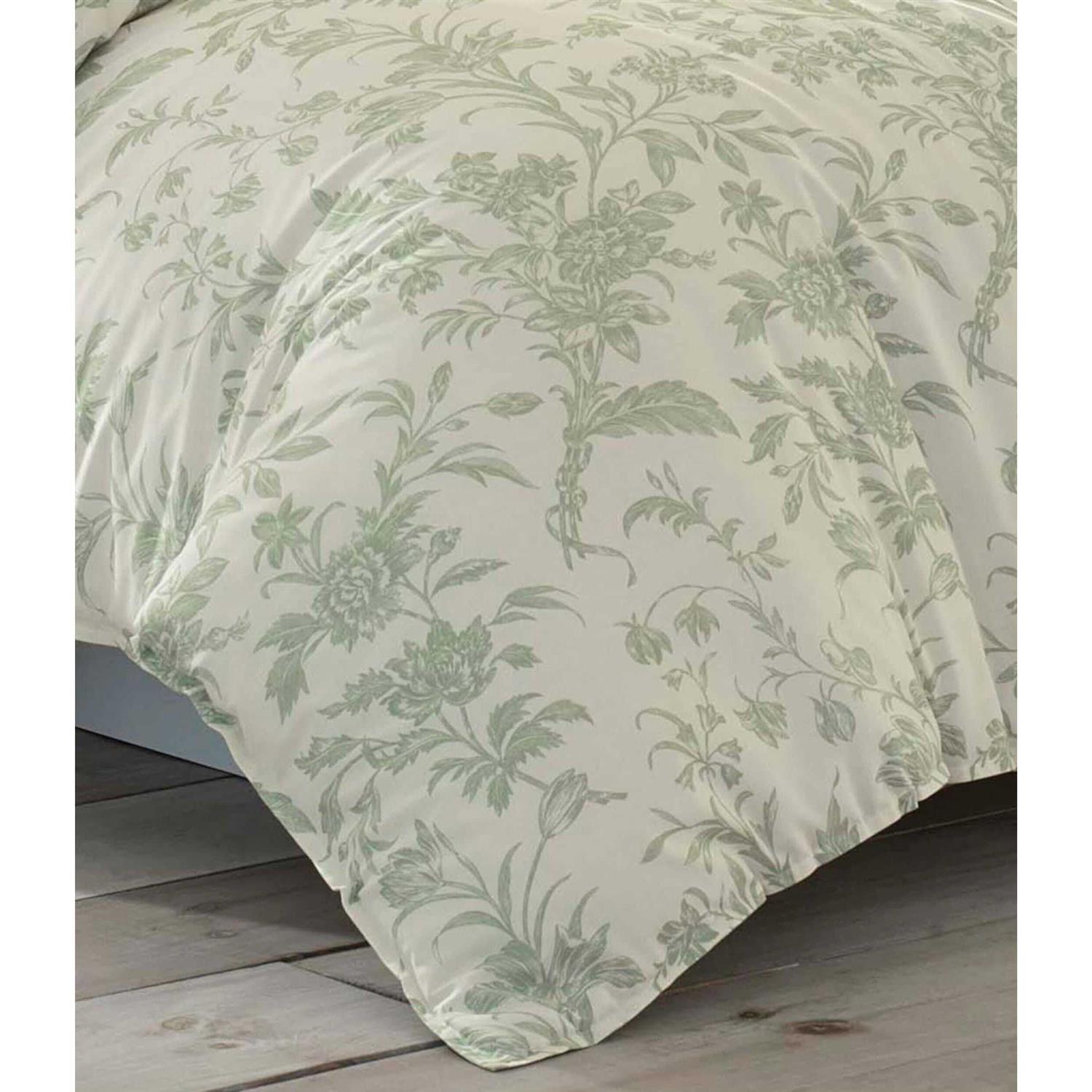 Choose from available sizes. Includes comforter, 1-2 pillow shams, 1-2 European pillow shams, and 2 decorative pillows. Made from comfortable cotton. Jade green floral pattern against cream white background. Contemporary design. Machine washable in cold water. Sophisticated and stylish, the Natalie Comforter Set by Laura Ashley is a refined take on classic bedding. Featuring a floral pattern of twisting vines and blooming flowers stitched in jade green against a white backdrop, this comforter set is made from 100 percent cotton and comes in your choice of available size. The twin set is comprised of five pieces, including a comforter, a European pillow sham, a pillow sham, and two decorative pillows. The full/queen and king sets include all those items plus an additional pillow sham and European pillow sham. The modern botanical design runs throughout the pieces of bedding, complementing and building on the design. Machine wash for easy cleaning. Color: cream/green/jade.