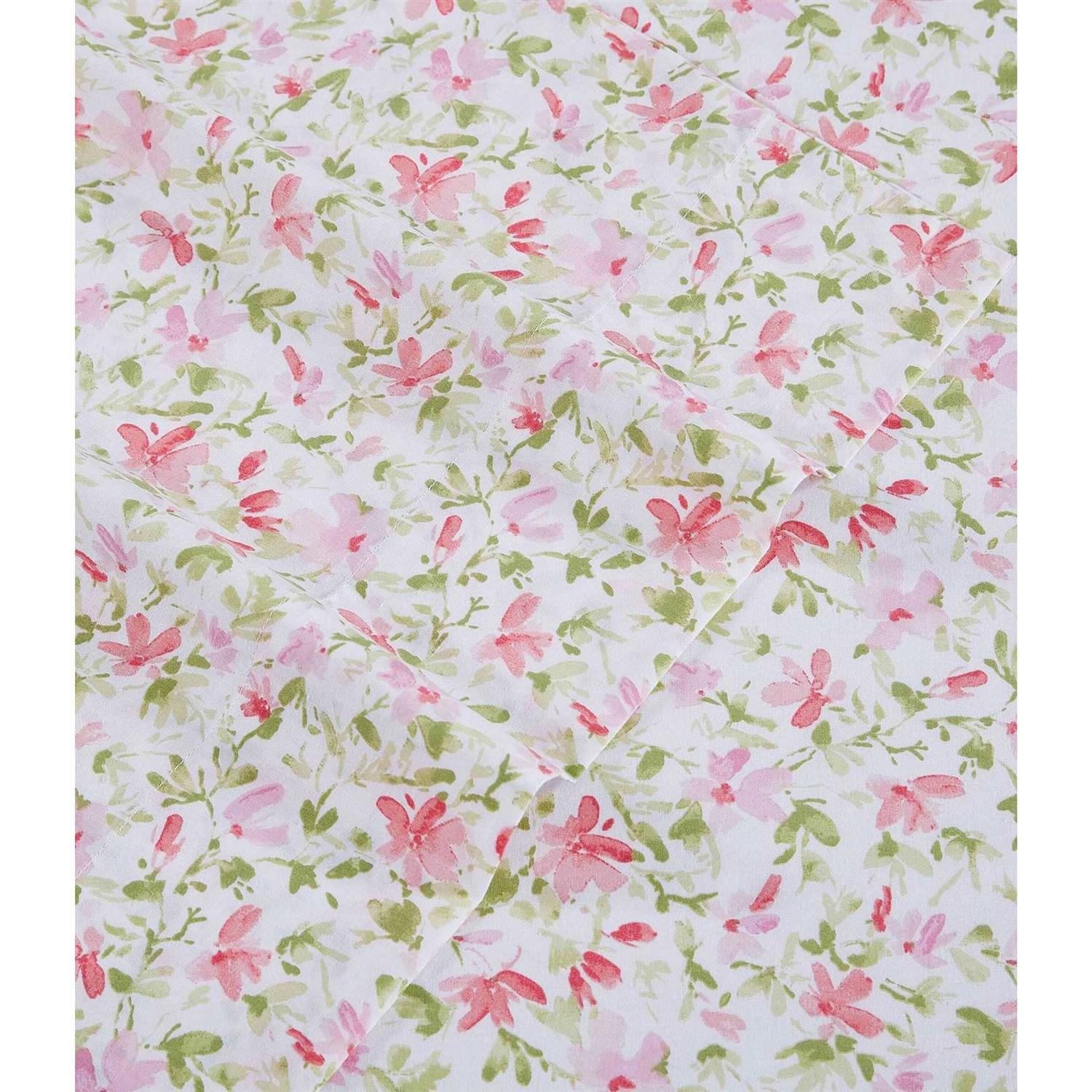 Laura ashley printed percale sheet sets add a charming romantic touch to your bedroom with timeless florals in beautiful color palettes. mix and match them with Laura Ashley comforters duvet covers or quilts. add a dash of color to a solid white bedding ensemble. these 200 thread count sheets are cool to the touch breathable and lightweight. perfect for long-lasting comfort they be softer with each wash. Each sheet set includes one flat sheet one fitted sheet and two pillowcases (one for twin and twinxl sizes). The fully elasticized fitted sheet prevents slipping from the mattress and ensures the perfect fit. This set fits queen and king mattresses up to 18″ deep (16” deep for twin size 17″ for full size). Machine washable for easy care.
