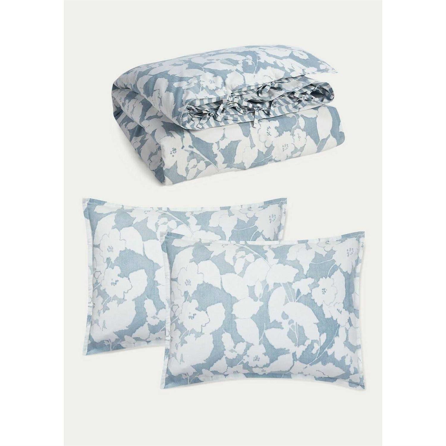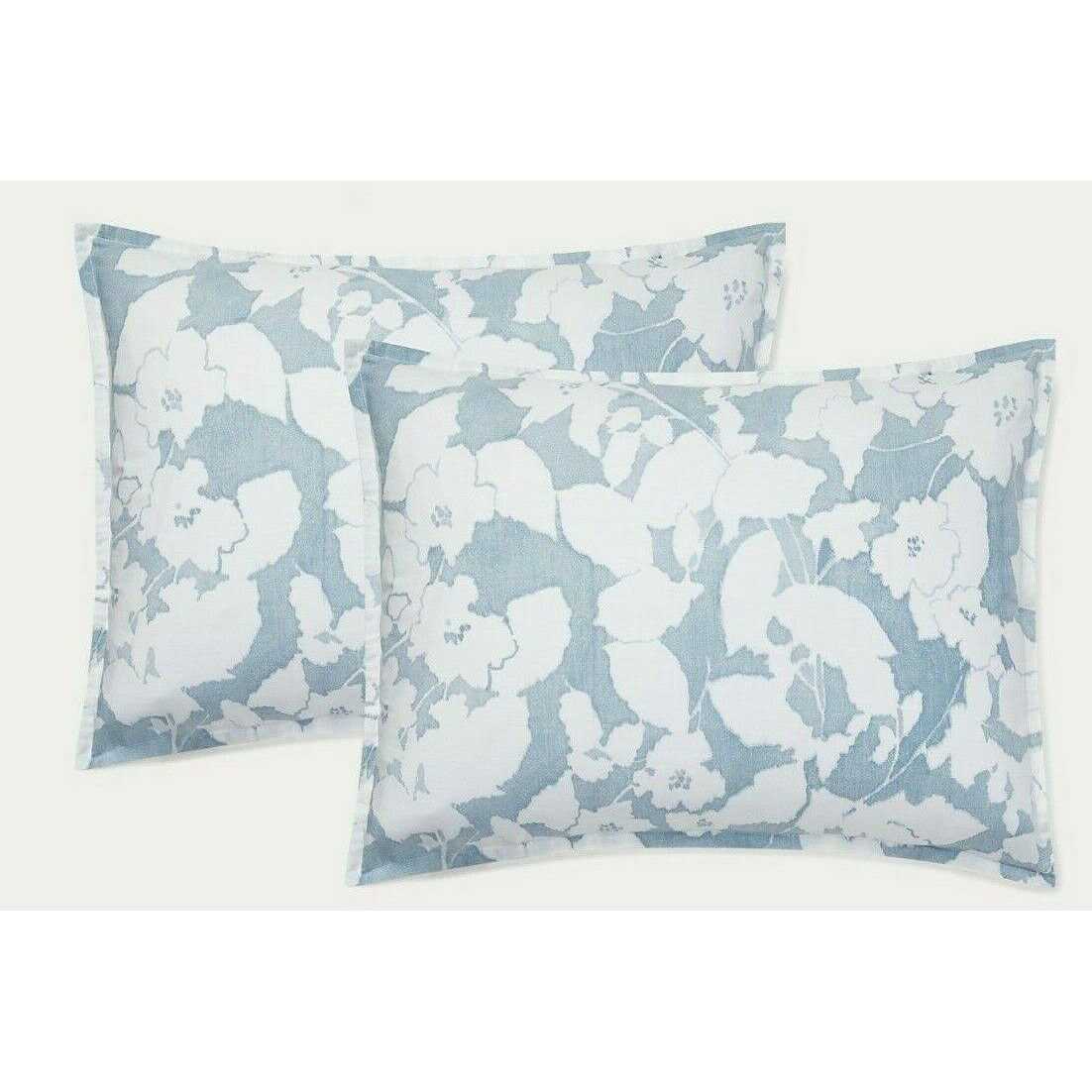 The hand-painted modern country silhouette floral in chambray and white is a refreshing pattern for a whitewashed summer country home. The scale shift of the tiny overall leaf-patterned sheet and the woven geometric design on the euros, paired with the classic cream blanket makes for a chic refresh of a classic country floral.