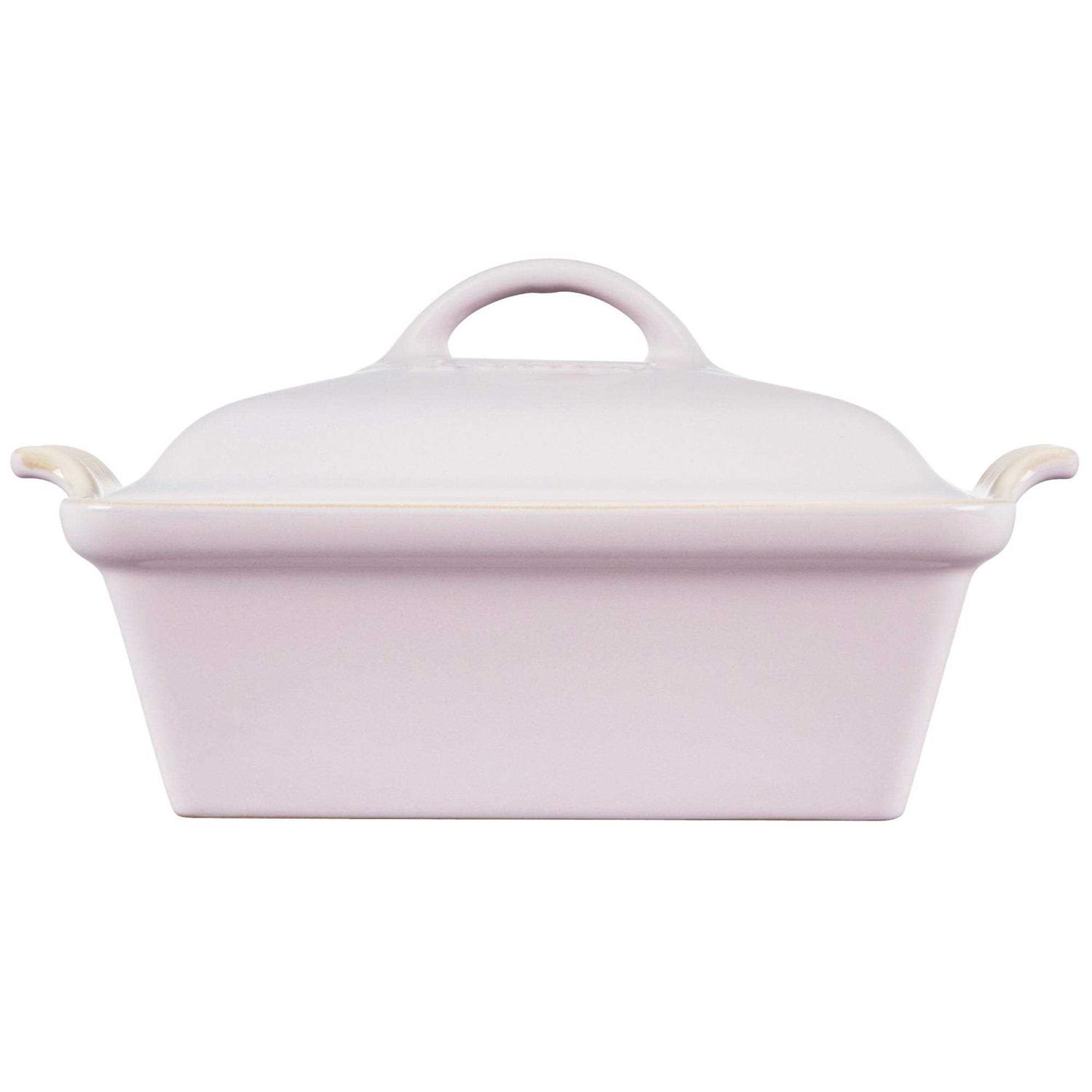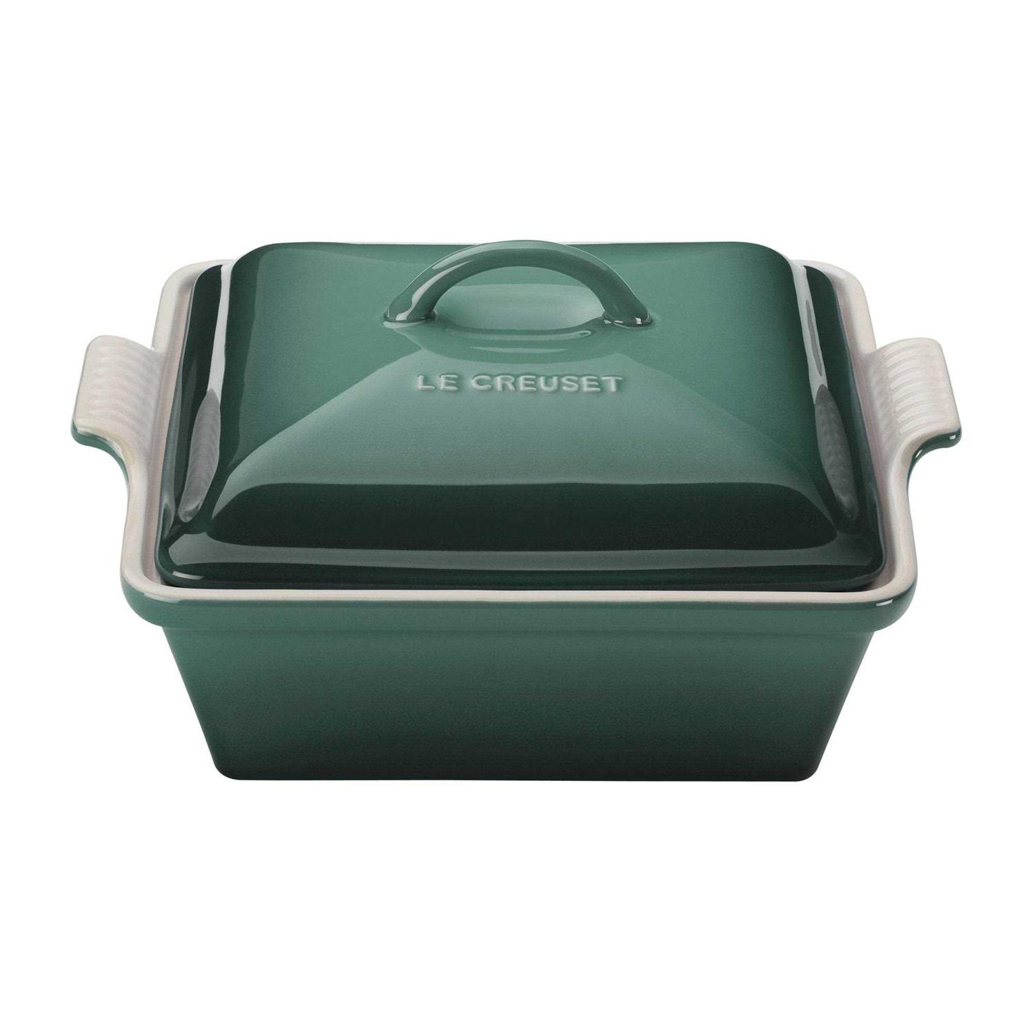 A 10″ square baker deep enough for thick, bubbly lasagnas and casseroles or meat roasts with a layer of vegetables beneath. Le Creuset Stoneware is an extremely durable and versatile choice for one-dish baking, serving and storing. The Heritage collection brings back vintage designs from Le Creuset’s archives. Tight-fitting lid seals in moisture so foods emerge tender and juicy. High-fired stoneware is exceptionally strong and ensures even heating. Safe for oven, broiler, freezer and microwave. Durable porcelain enamel-glaze finish is easy to clean and resists chips, scratches and stains. Will not absorb odors or flavors. Vibrant, colorful exterior for oven-to-table presentation. Flared handles with traditional scalloped design offer a steady grip.