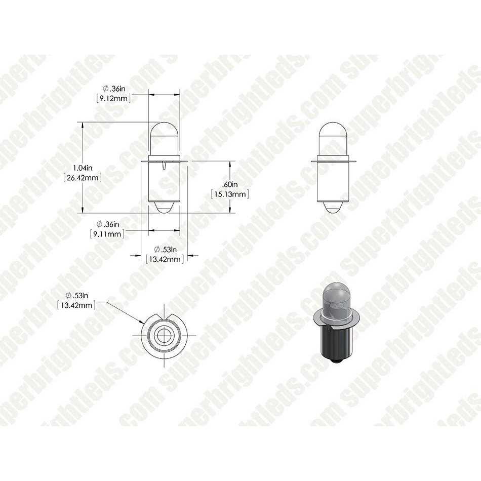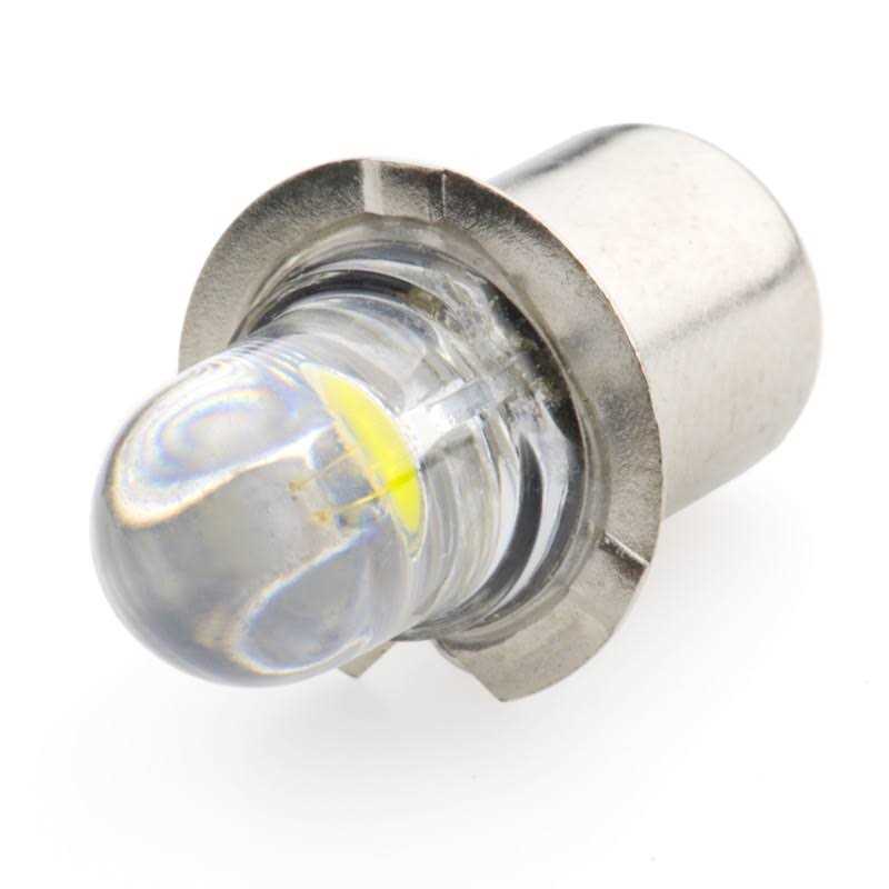 Cool White LED Flange Base Flashlight bulb with Wide Voltage Range. 1 x 1 Watt White LED. Will operate from 1 to 6VDC _1~4 battery cells. 90~200ma, tight 21 degree beam pattern, bottom contact must be connected to positive. Price for each.
