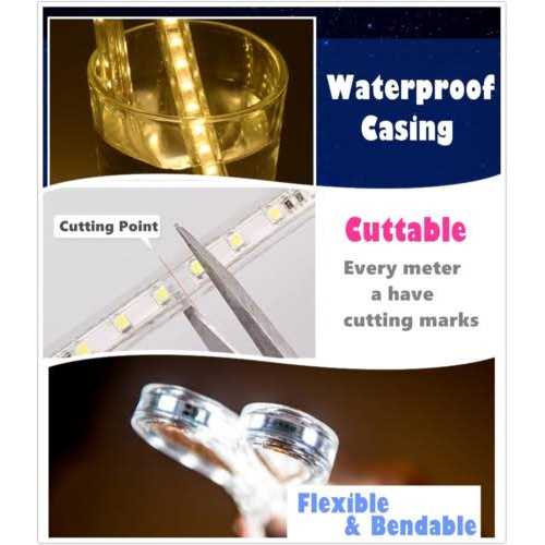 IEKOV 110-120V 5050 SMD LED strip Light is perfect decoration light strip for Holiday, Wedding, Party, Christmas, Halloween, New Year Festival Waterproof, can use Indoor and Outdoor, Easy to install, Plug and Play without wiring, 110-120V AC Powered Low Power Consumption, Super Bright LED light running with Low Temperature Clear PVC tubing is Flexible, Transparent and Durable and it can be shaped, formed or bent in any angle to perfectly fit the space being decorated Eco-friendly: No splash and UV, without mercury and no damage to human and environment SPECIFICATIONS: High Voltage AC 110-120V Led Light Strip Color: RGB (Red, Green and Blue) LED Type: 5050 SMD LED, 60 leds/Meter Waterproof Grade: IP67 Waterproof View angle:120 Input Voltage: AC 110-120V Working Temperature:-20C to 50C Size: L10m x W1.6cm x H0.9cm 24 KEY REMOTE and POWER ADAPTER: Powered by 2x AAA batteries (Batteries isn’t included) Color:12 Colors change 4 Light Pattern: Flash / Strobe/ Fade/ Smooth 2 Light brightness control Keys LED light strip is waterproof but the power adapter is not waterproof, so keep it in a dry place/waterproof box Use waterproof tape to bundle the connection between led light strip and power adapter and end cap FEATURES: *Low power consumption, Super-bright led light running with low temperature *All the light spread and completely smooth, luminous very even *Flexible, Slim, compact and flexible PCB strip. Applicable for bendable or angled patterns, or in continuous rows *Cuttable and linkable. It can be cut in every 1.64ft/0.5m along the cutting marks, without damaging the rest strips *LED Type: High Quality 5050 SMD LED, high intensity and reliability, Long lifespan up to 50,000+ hours APPLICATION and INSTALLATION: * Bedroom Light * Garden Light * Bathroom Light * Kitchen Light * Dining backlight * Accent Light * Signage Light * Under cabinet Light * Cove Light * Bar top Light * Club Backlight * TV backlight * Under counter Light * Task Light * Cabinet Light * Display case Light PACKAGE INCLUDES: 1x 10M of 5050 RGB LED Light Strip with Power Cord 1x 24 key remote controller 1x IR Control Box 15x Channel Mounting Holder 1x End Cap 1x User Manual