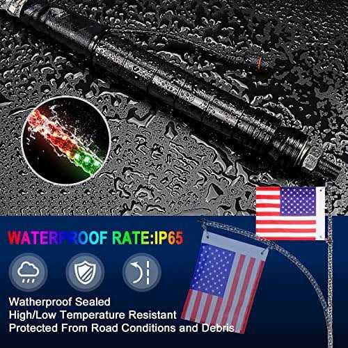 【Upgraded whip lights】: 240 lights are closely arranged on the light bar, providing more leds,brighter and more durable lighting than other LED whips. utv accessories Customizable 1000+ color-changing modes including 500+ colors, 300+ flashing patterns, and Chasing/Dancing Light controlled by the APP. 【Wide Application】: The LED Whip Lights can be used as a signal light, warning light, or chase light to let those around you know exactly where you are. avoiding something unkown.It fits most of cars, whatever it is UTV, ATV, RZR, dune buggy, golf carts, Off-Road Polaris, trucks, and more. The LED whip is wrapped in high-toughness EVA transparent heat-shrinkable tubes, so you don’t need to worry about it being damaged by sand, dust, or rain. 【Simple Installation】: 1. Release the base, mount it on hole, and then connect the base with whip light. 2. plug and play the whip lights, and then connect it to switch and power. 【Package Contains】3FT-1PCS whip lights, Plug and 2 m harness and control box, remote control, connect/disconnect mounting base, US flag /easy release hook and adjustable grommet, hardwares, , user manual. LED whip lights for UTV are a popular off-road accessory that provide additional visibility and style to your vehicle. These lights consist of a flexible LED strip that is mounted on a tall antenna, giving your UTV a unique look and improved visibility when driving at night or in low-light conditions. LED whip lights for UTV are available in a range of colors and patterns, and some even come with app-controlled features that allow you to customize the lighting effects. They are easy to install and can be used on a variety of vehicles, including UTVs, ATVs, trucks, dune buggies, and more.