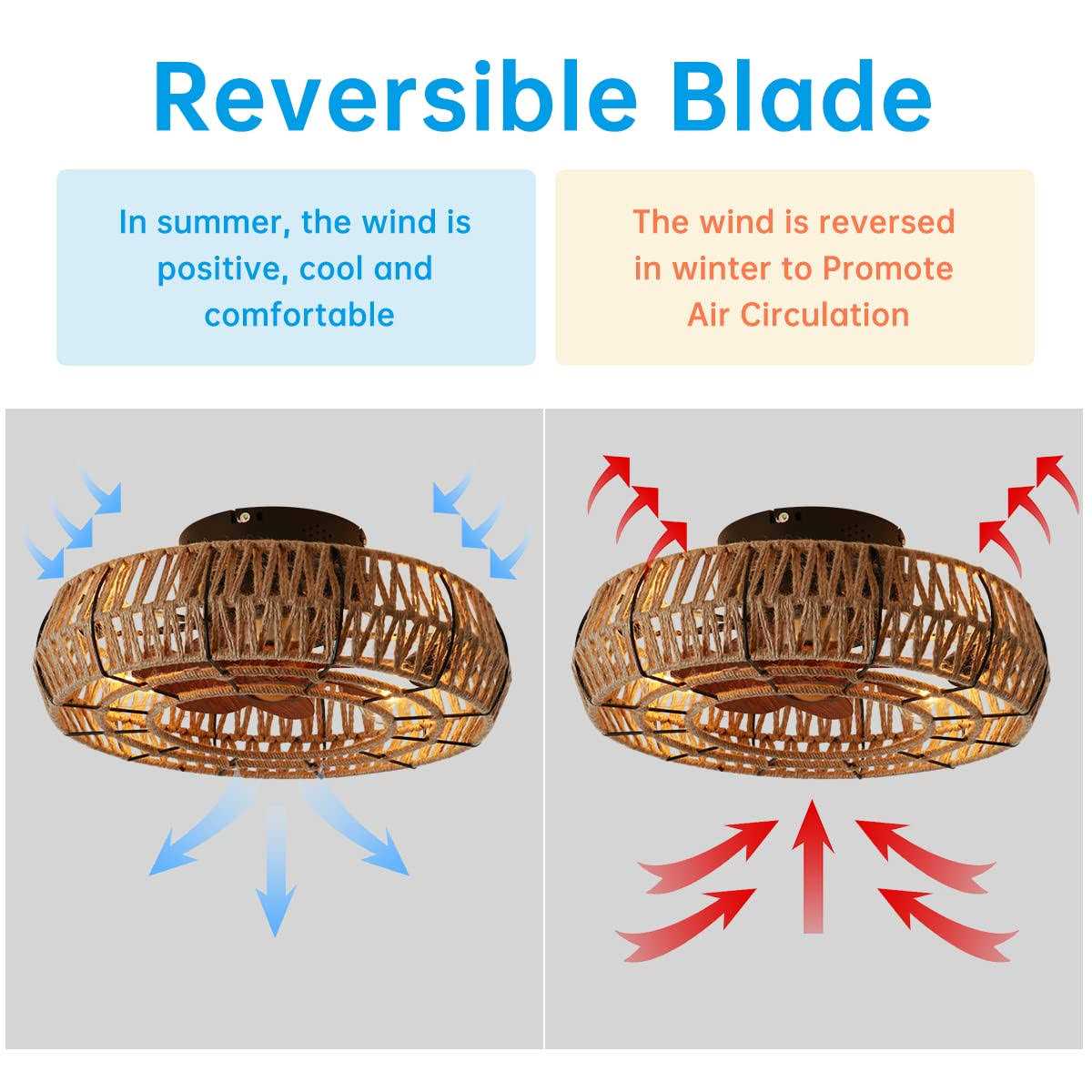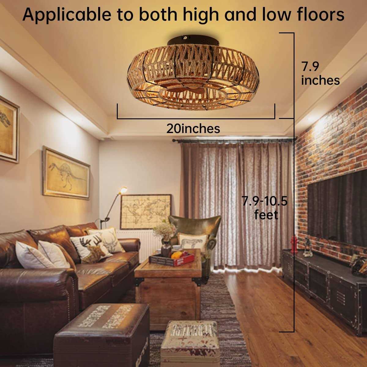 Ceiling Fan with Lights and Remote Control: This caged bladeless ceiling fan with metal mesh cages are mostly wrapped with twine as a nice vintage decoration, whether your style is an edgy city loft or a laid-back modern country. The design with vintage decoration ceiling fan and Imitation wood grain 7-blade, which is beautiful and functional, is a perfect complement, for bedroom, dining room, living room, kitchen. Indoor Low Profile Ceiling Fan Light: The farmhouse enclosed ceiling fans with lights has been rigorously tested and installed with a variable frequency motor that can reverse the wind direction, 90-250V/15W ultra-quiet low decibel and provides strong airflow and quiet performance, keeping your room fresh and comfortable. Please buy strictly certified E26 screw explosion proof bulbs. Easy to Install: Most functional components of cage low profile ceiling fan set has been assembled, so you can finish the installation in a few minutes. Please refer to the installation book and installation video. It is very convenient to install or replace bulbs. br / 7 × ABS imitation wood grain fan blades /b br / The hemp rope ceiling fan with Light, which is built in 7 × ABS fan blades, 6 Speed Adjustable Reversible, can restore comfortable experience of natural wind, create a cool and comfortable environment for you. br / Round iron mesh lampshade /b br / The shell is designed with a circular iron mesh and wrapped with hemp rope for decoration, which makes this ceiling fan light look more retro industrial style. Remote control: The remote control can be used to separately control the on/off of the lights and the 1-6 fan speed switch. br / 2. Timer: The timer function on the remote control can set a 1/2/4 hour timer, which saves energy and allows you to sleep peacefully. br / 3. Wall Control: The wall switch can control the light switch alone, but not the fan.