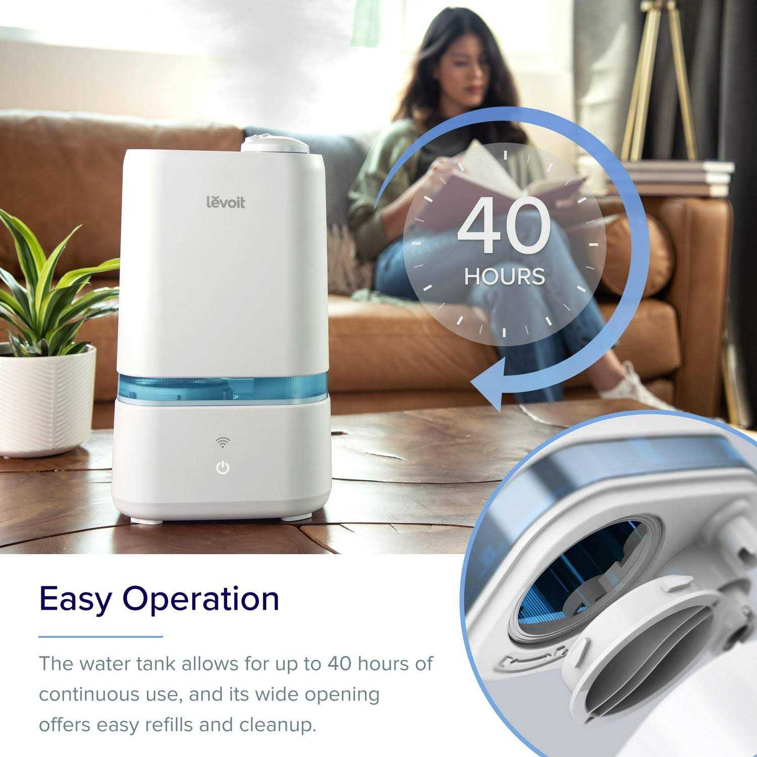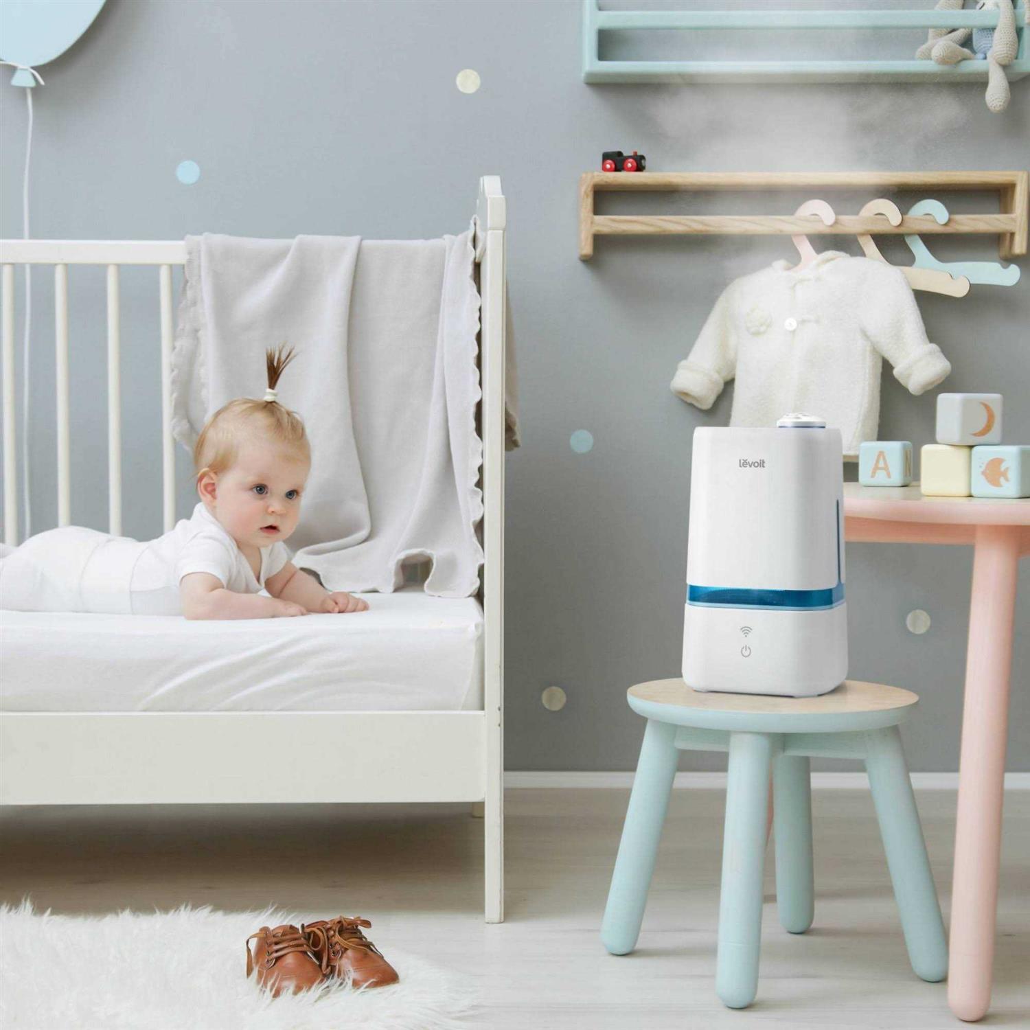 Levoit Smart Ultrasonic Cool Mist Humidifier’s convenient smart features and aromatherapy help revitalize the air in offices, nurseries, and other mid-sized rooms for up to 40 hours. Enjoy full control of your humidifier from your phone with the free VeSync app. Monitor your room’s humidity, create schedules and timers, and more. It can cover virtually any room in the house with an effective range of up to 375 sq. ft. The near-silent noise levels help you sleep, while the mist provides relief from dry skin and allergies.