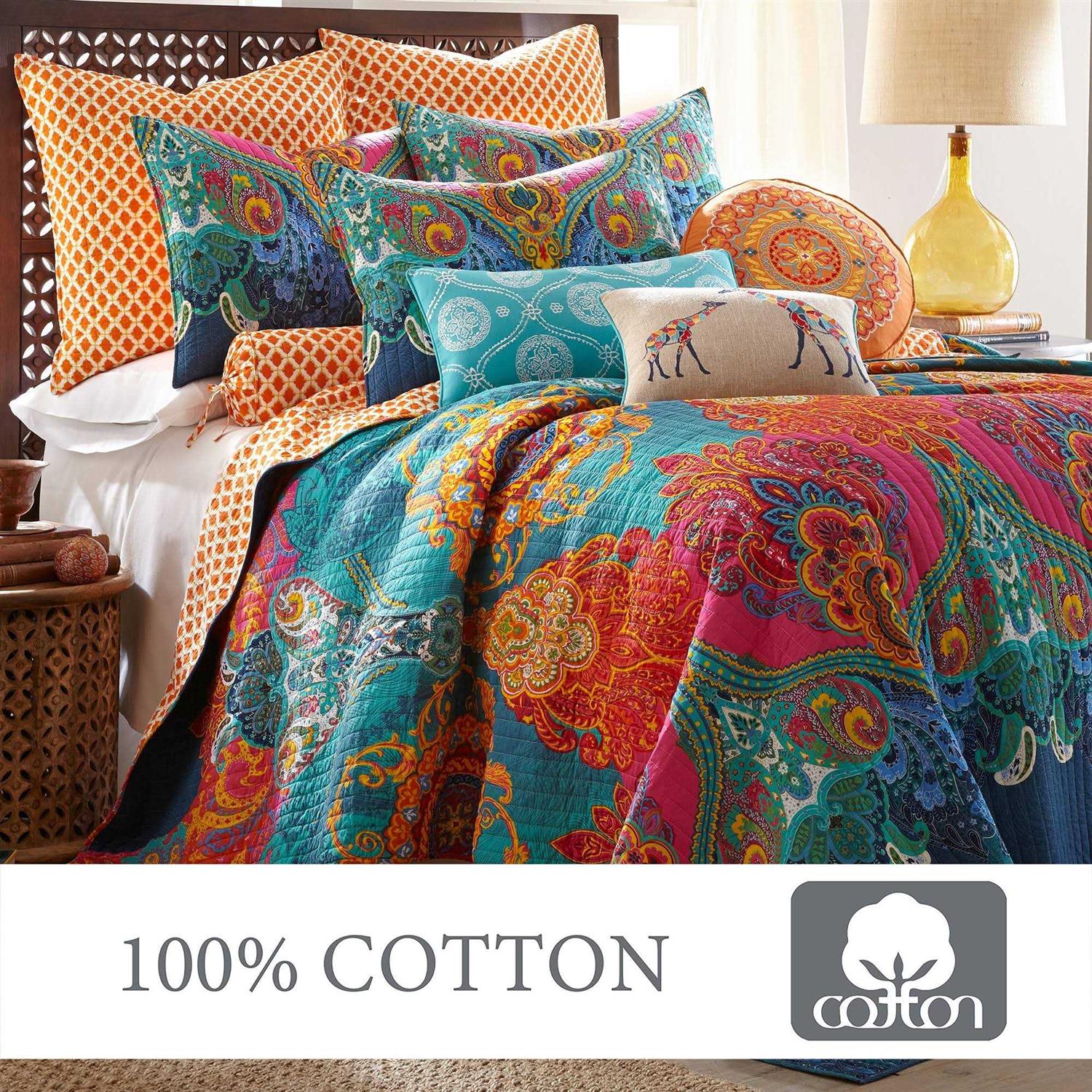 The Mackenzie Reversible King/Cal King Quilt Set by Levtex Home is inspired by the vibrant patterns and-colors of exotic bazaars. This exuberant mix of pattern and-color design will immediately transform your bedroom. Made with the softest lightweight cotton, this reversible quilt features a swirl of damasks and medallions in playful-colors, reversing to an orange and cream medallion on the back. Enjoy this for-years to come.
