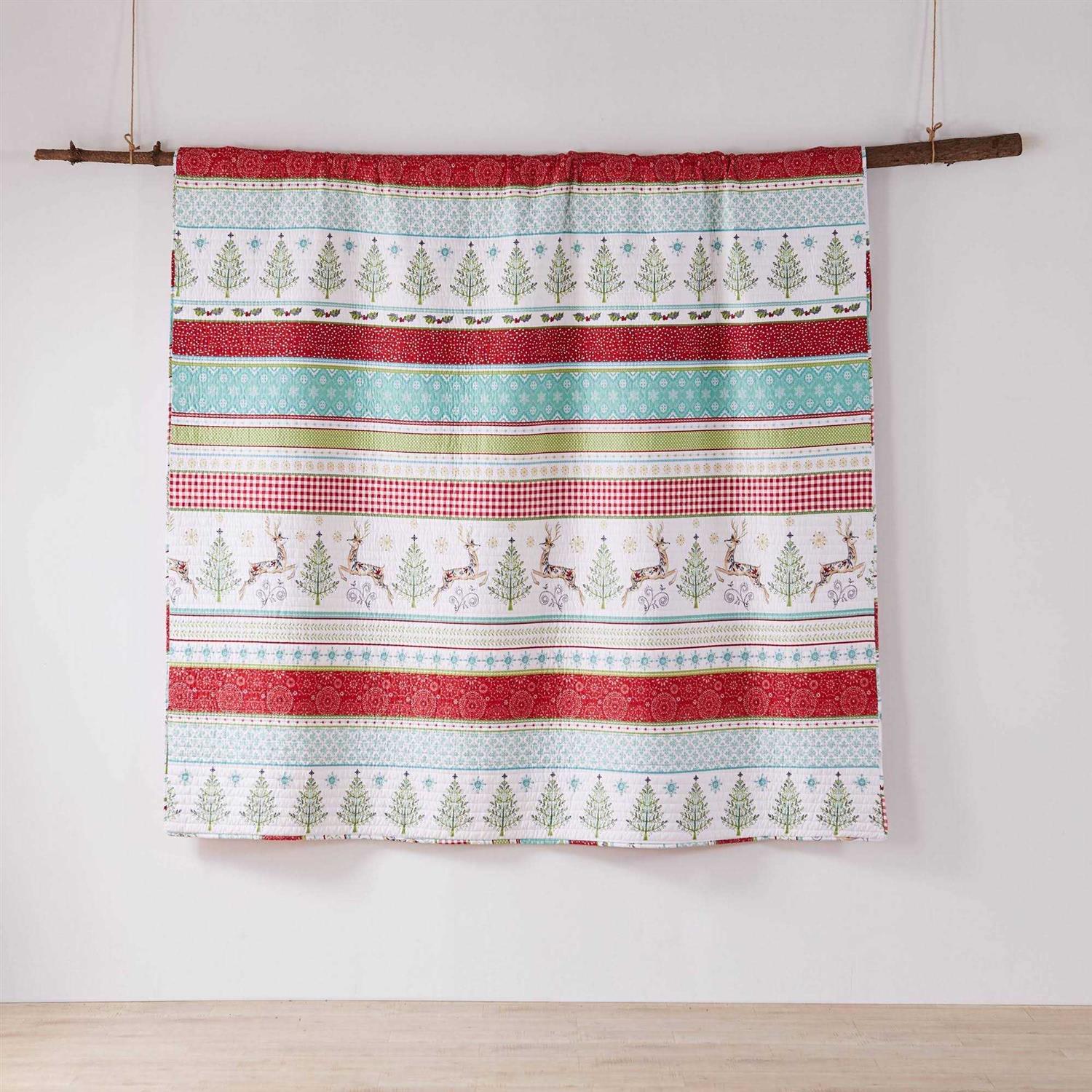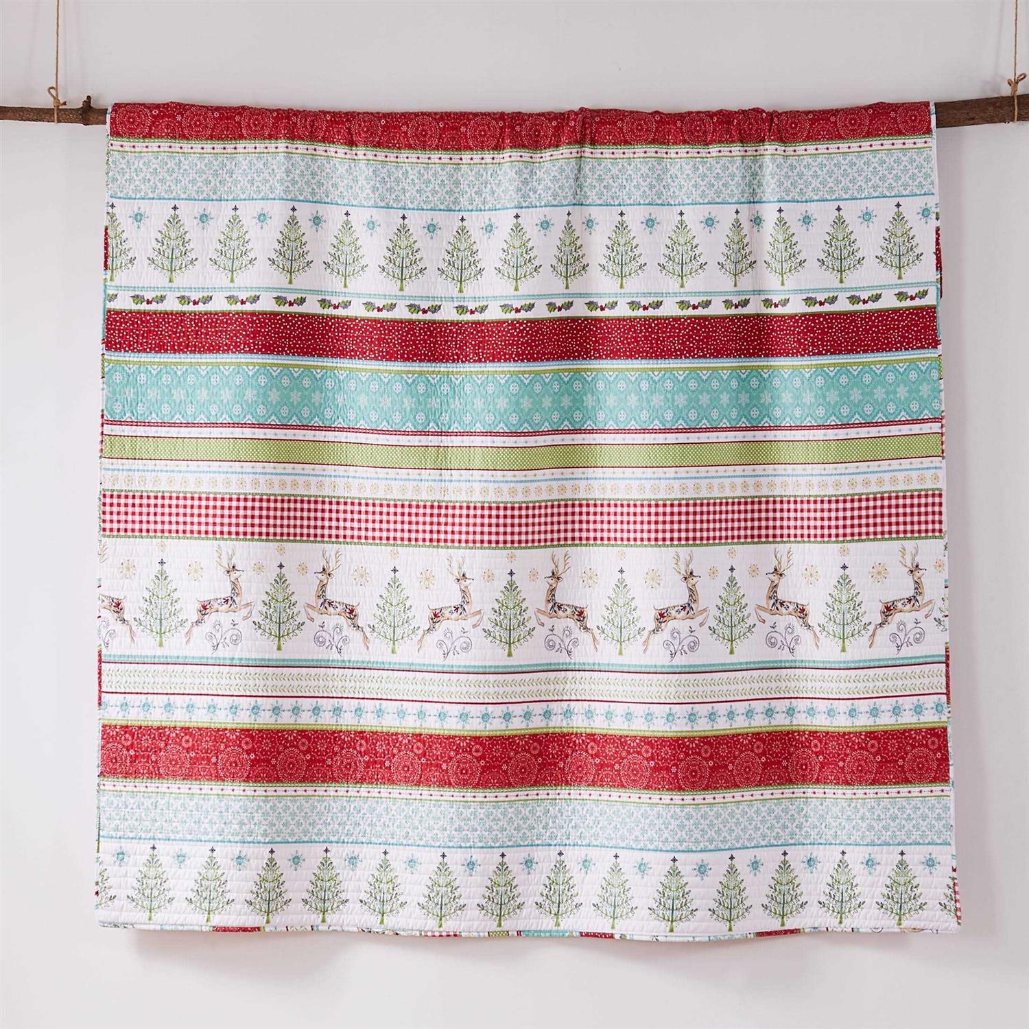 The Comet and Cupid Reversible King Quilt by Merry and Bright for Levtex Home is inspired by painted folk Christmas scenes. Offered in red, green white and teal, this design will immediately transform your bedroom. This reversible quilt features rows of deer, Christmas trees, plaids and patterns on the front, reversing to a red and white sweater print on the back. The King Quilt (102x86in.) is microfiber, filled with a cotton rich filler and is machine washable. Enjoy this for years to come!