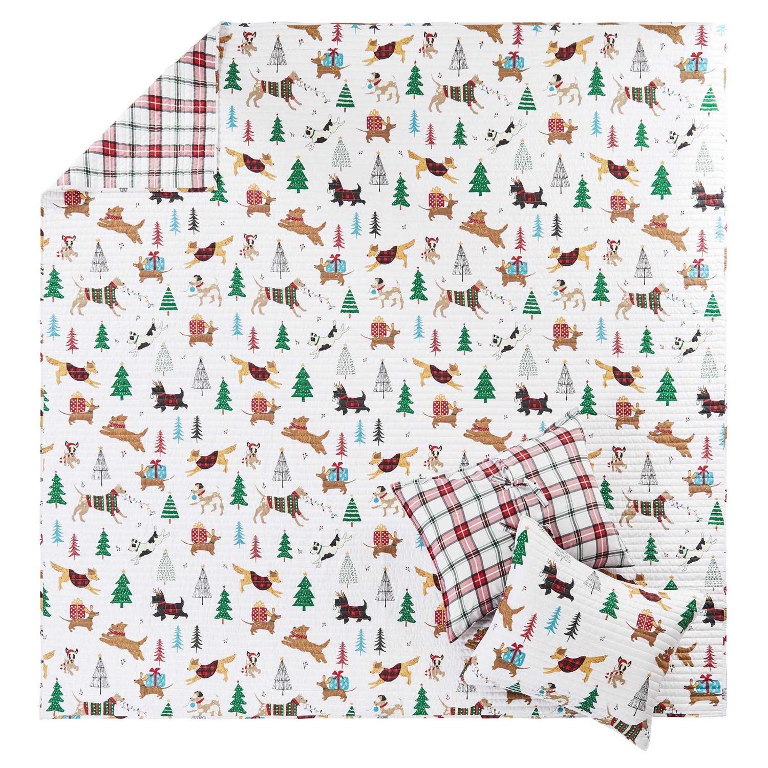 The Jingle Paws Reversible Quilt Set by Merry and Bright is inspired by holiday cheer with pets. Offered in red, green and white, this design will immediately transform your bedroom. This reversible quilt features a playful scene of many dogs running around and decorating trees for the holiday on the front, reversing to red and green plaid on white ground. on the back. The Quilt and Sham have a microfiber front and back, filled with a cotton-rich filler, and are machine washable. Enjoy this for years to come!