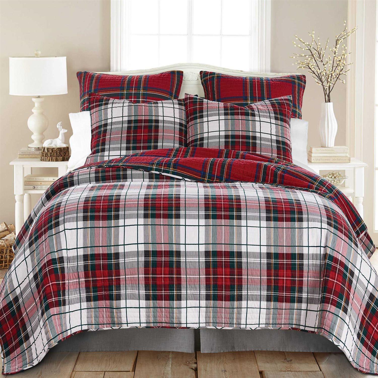 The Spencer Plaid Reversible King Quilt by Thatch Home for Levtex Home is inspired by traditional woven Scottish tartans. Offered in red, green and white, this design will immediately transform your bedroom. This reversible quilt features a red, green and gold on white plaid in cotton on the front, reversing to a a green, gold, blue and white on red plaid in microfiber on the back. The King Quilt (106x92in.) is filled with a cotton rich filler and is machine washable. Enjoy this for years to come!