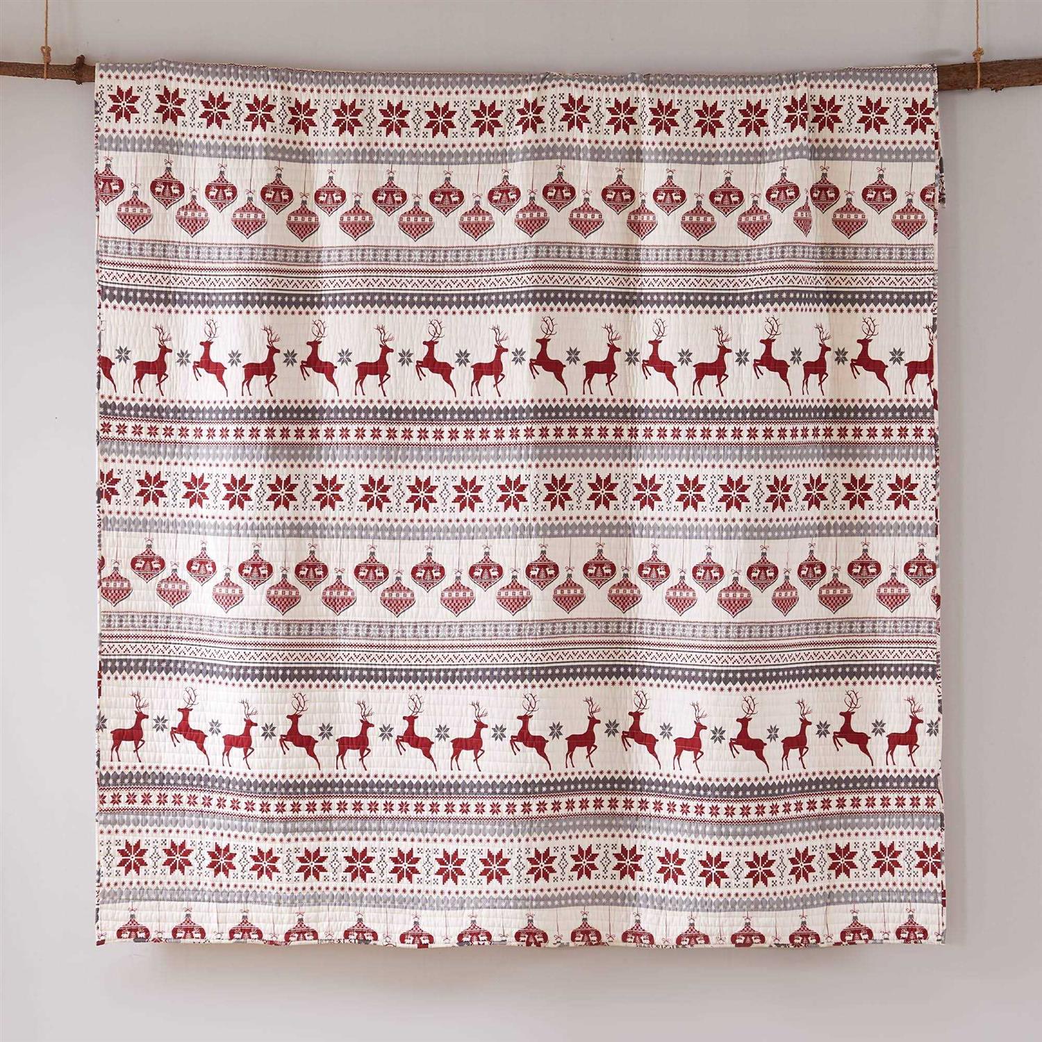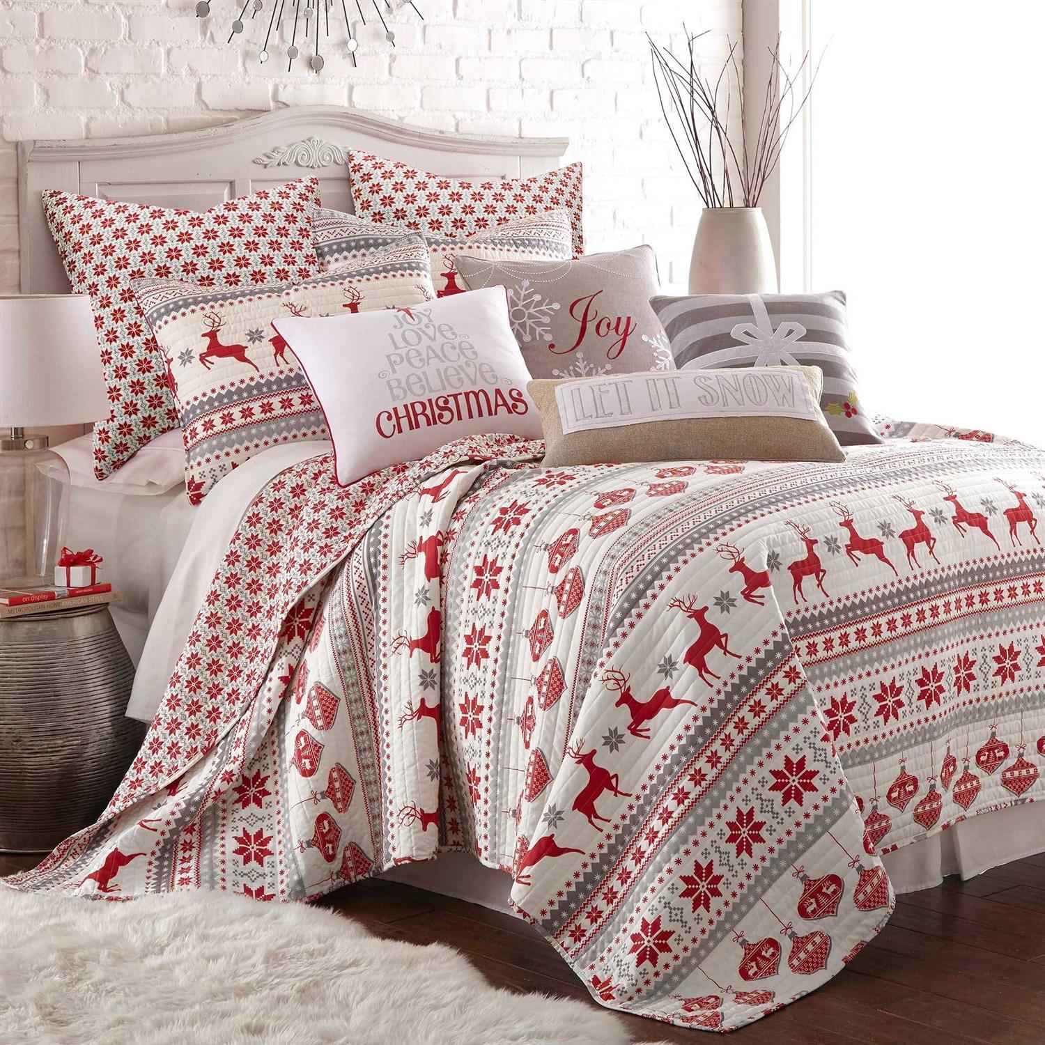 The Silent Night Reversible Quilt Set by Levtex Home is inspired by cozy fair isle sweater knits. Offered in grey, red and white, this design will immediately transform your bedroom. Made with the softest pre-washed cotton, this reversible quilt features a print of deer, ornaments and snowflakes in rows, reversing to snowflake medallion on the other. The Quilt Set is machine washable and includes the quilt and pillow shams. Bring the holidays home!