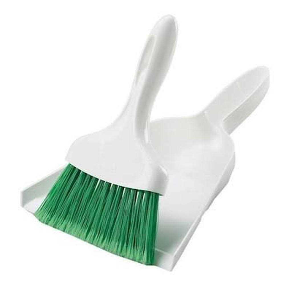 The Libman Dust Pan with Whisk Broom Set (White with green fibers) includes a 10 inch dust pan and a whisk broom that easily snaps into and stores inside the pan. It is excellent for all quick pick-ups. 7 inch wide sweep. 42 tufts of flexible, split-tip polymer fibers that pick up fine particles. Hanger hole for easy storage. Ergonomically designed handle. 6 dust pants and whisk brooms per carton. Sold as 6/Carton.