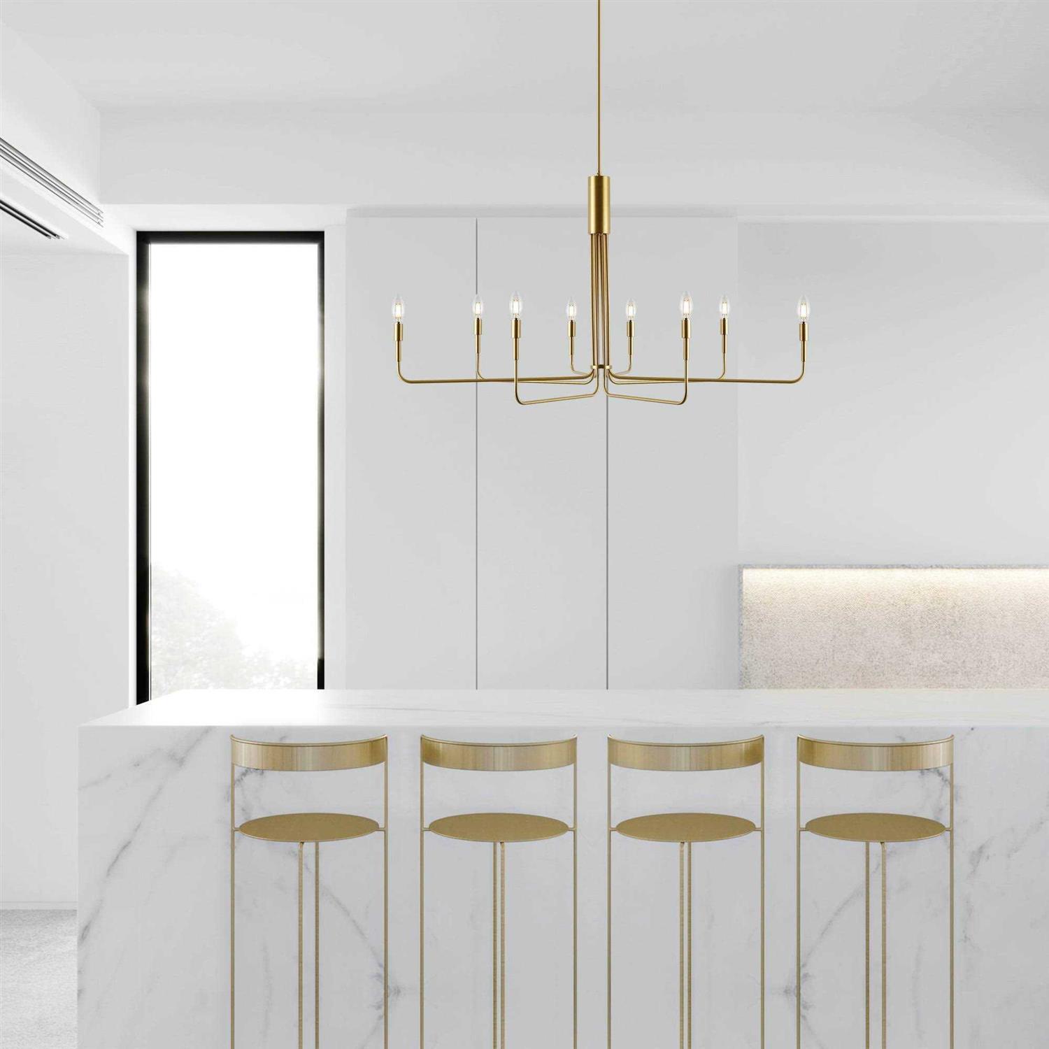 Inspired by old-world candelabras the Bella 8-Light Chandelier conjures the glamour of a Parisian salon. Still its simple silhouette and brushed brass finish make it entirely at home in a contemporary setting. Hang it over your dining table or in the living room and watch it cast a delightful spell.