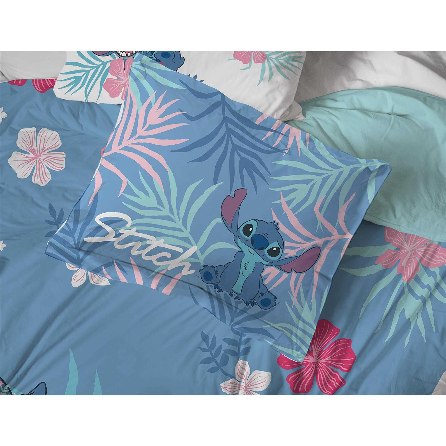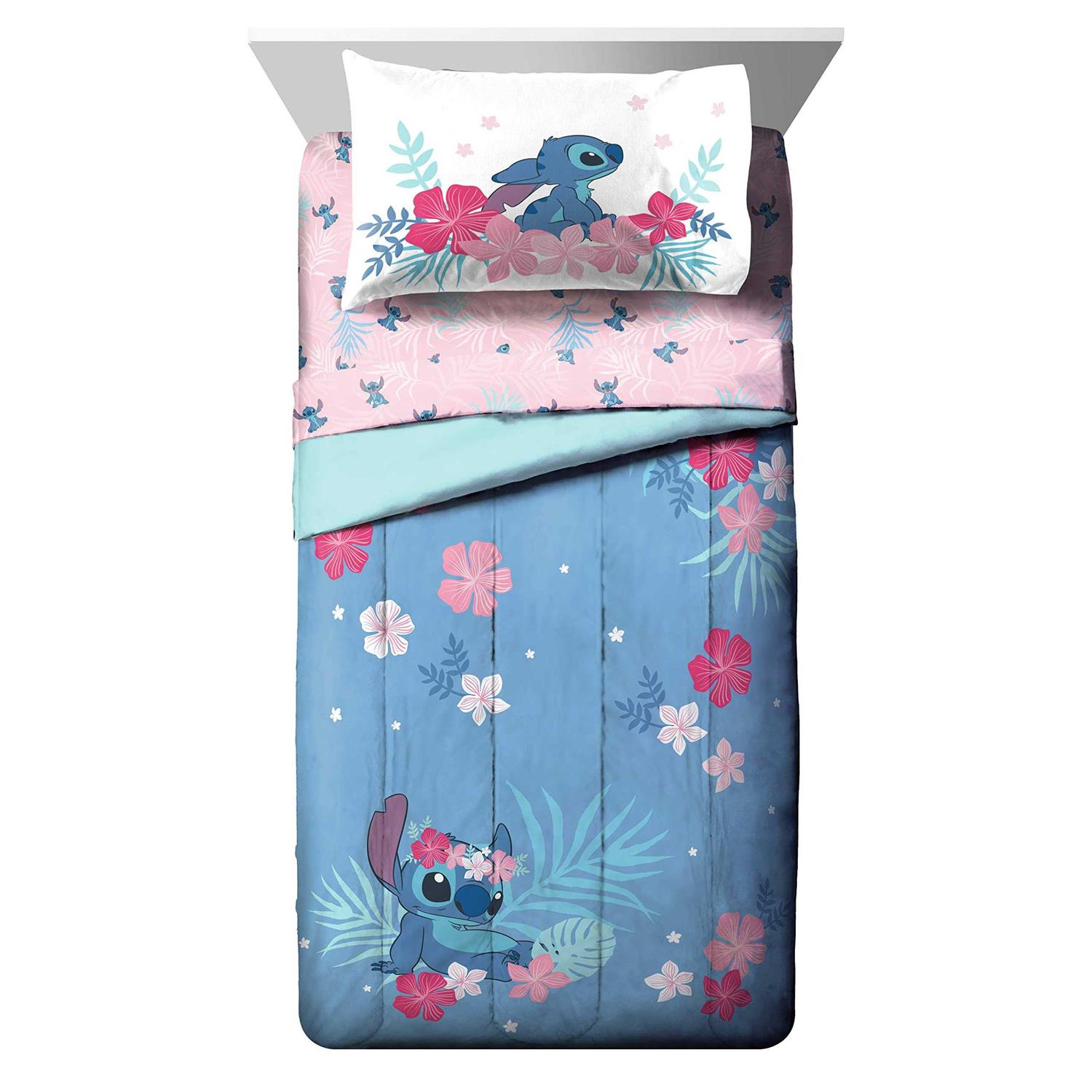 Make any bedroom into a dreamy paradise with this Lilo & Stitch Bed Set. This comfortable Queen Bed Set has everything you need to freshen up your bedroom; including a comforter, shams, fitted sheet, flat sheet, and pillowcases. The comforter features an adorable Stitch relaxing in paradise, surrounded by colorful tropical flowers. It pairs perfectly with the light pink sheet set, also patterned with Stitch and pretty palms in the background.