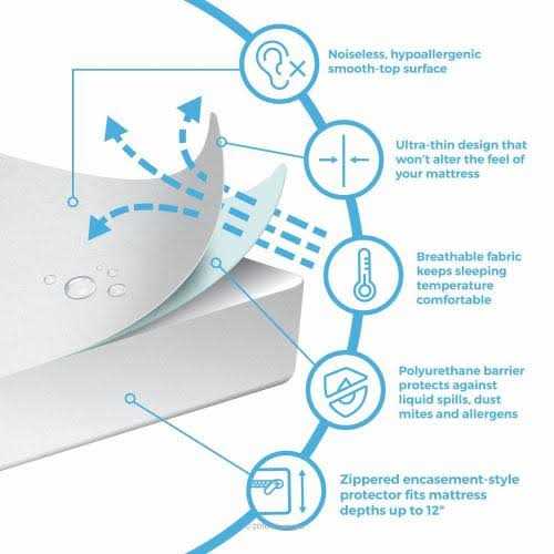 Offering complete protection on all sides, this mattress cover features soft, breathable, noiseless fabric with a waterproof layer on the inside. Not only does the protector block out fluids, spills, bed bugs, dust mites, and allergens, but it also promotes a soft, smooth, and clean sleep environment. Machine washable and dryer safe, this zippered cover is easily removed for convenient laundering. Encasement accommodates mattresses up to 12 inches thick.