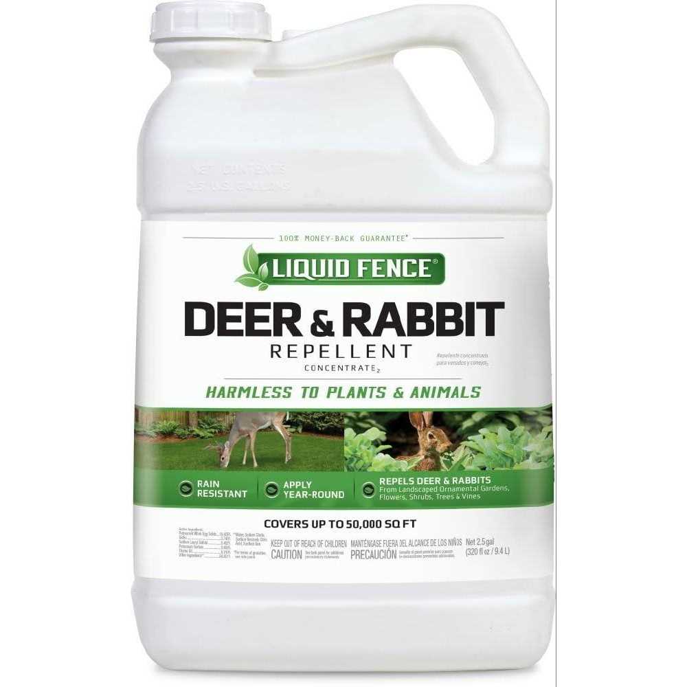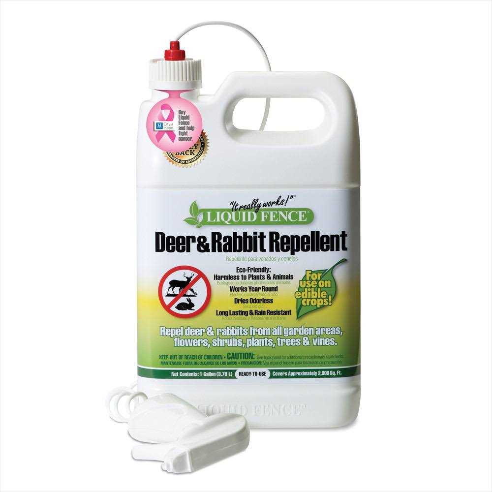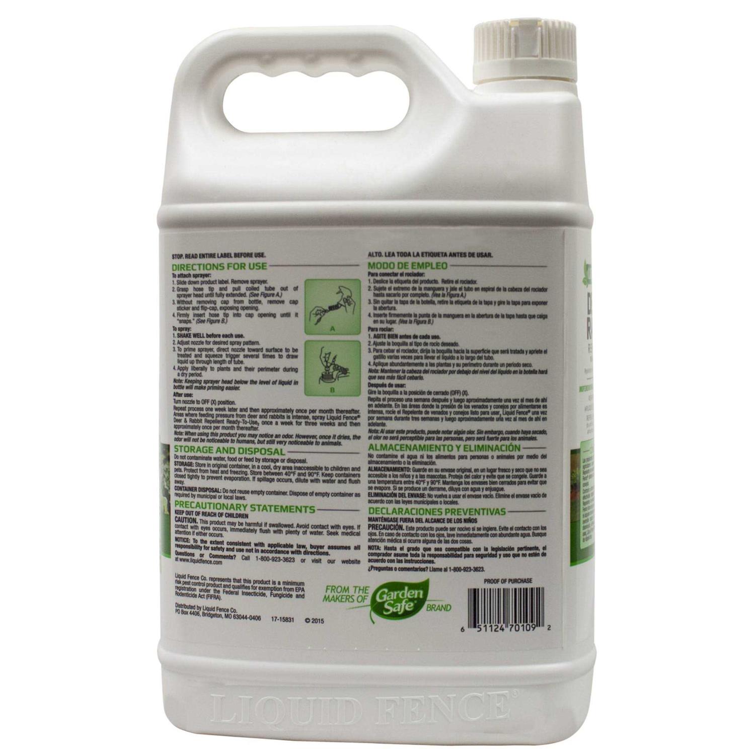 Liquid Fence 1-gallon deer and rabbit repellent is an eco-safe, ready-to-use spray that repels deer and rabbits from all garden areas, flowers, shrubs, trees and vines. The rain-resistant formula is harmless to people, plants and animals. This long-lasting repellent is four-season effective, and covers approximately 2000 sq. ft.