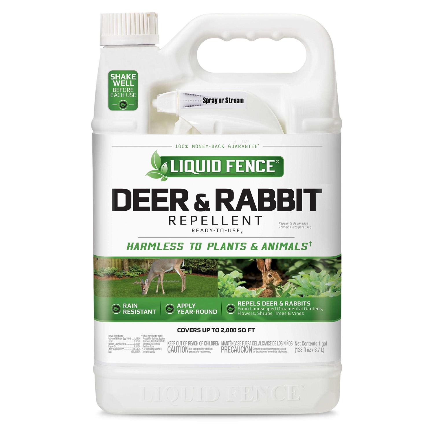 Deer and Rabbit Repellent is a ready-to-use DIY pest control spray that repels deer and rabbits from all garden areas, flowers, shrubs, trees and vines. The long-long lasting animal control formula is harmless to plants and animals. Product covers approximately 2000 sq. ft. and once sprayed, dries odorless. Liquid Fence Deer and Rabbit Repellent offers year round protection.