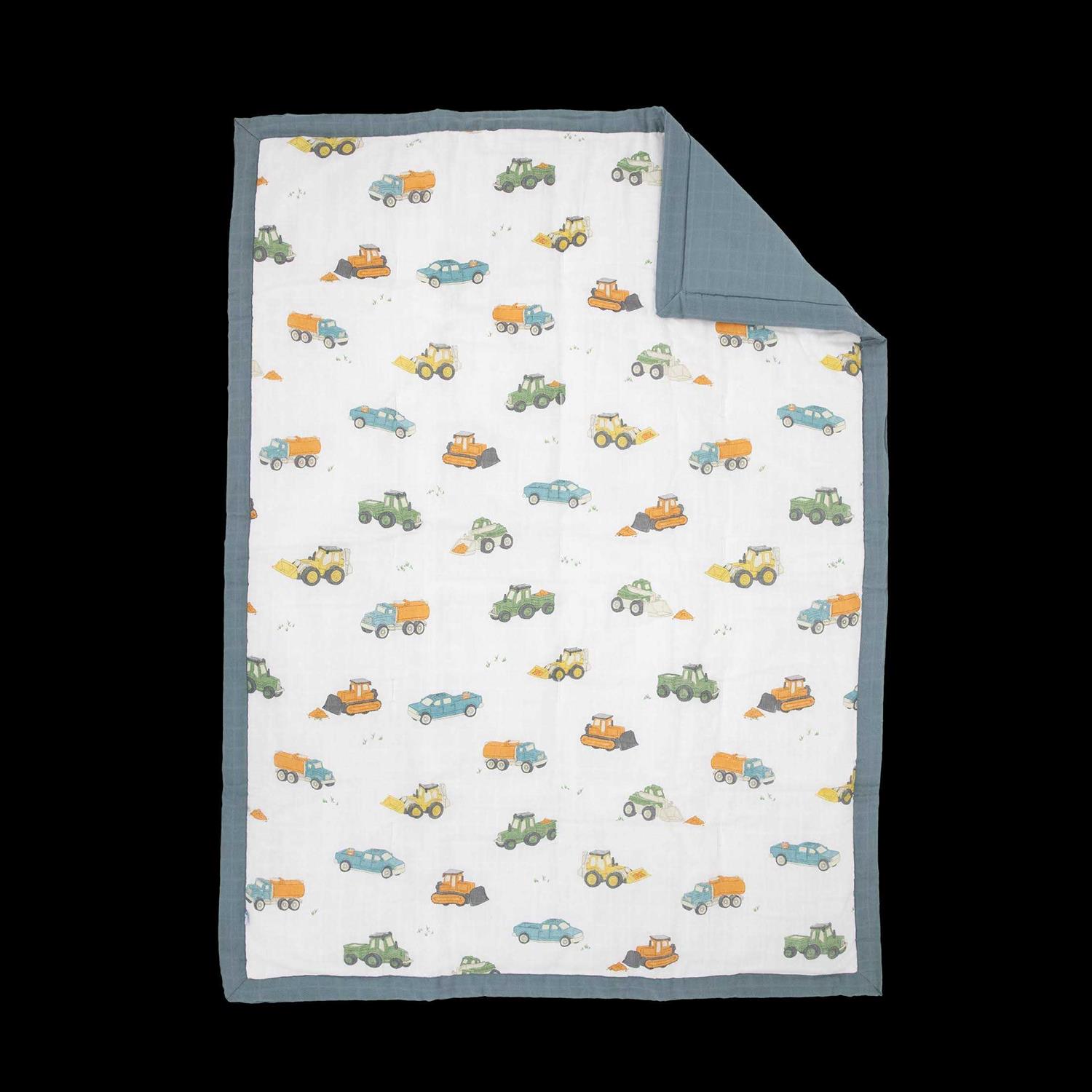 The Toddler Bedding Set features a variety of themes and prints to help bring their creativity to life as they transition from infant to toddler. Our toddler bedding sets are made from lightweight, lofty, breathable cotton muslin fabric that will keep your toddler warm without overheating. The pillowcases feature a tapered design, so they won’t slip off the pillows! Our 3 piece set includes: 1 Toddler Comforter, 1 crib sheet, 1 pillowcase. Color: Work Trucks.