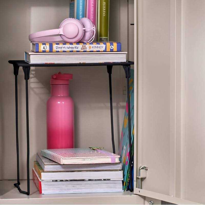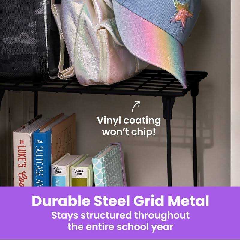 Stackable shelves built for school lockers Extra tall height at 12″ Made for locker organization Can purchase multiple to be stacked on top of each other Unfolds to be placed in and taken out of lockers easily Made of wire metal No tools needed for assembly