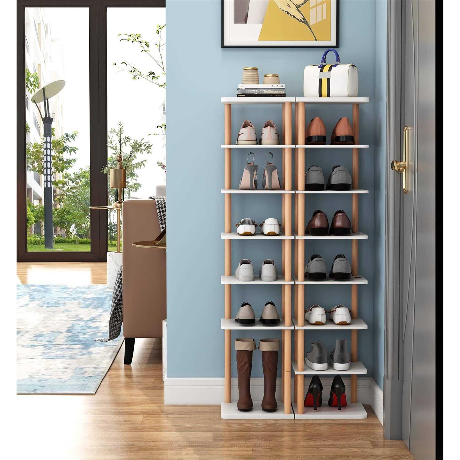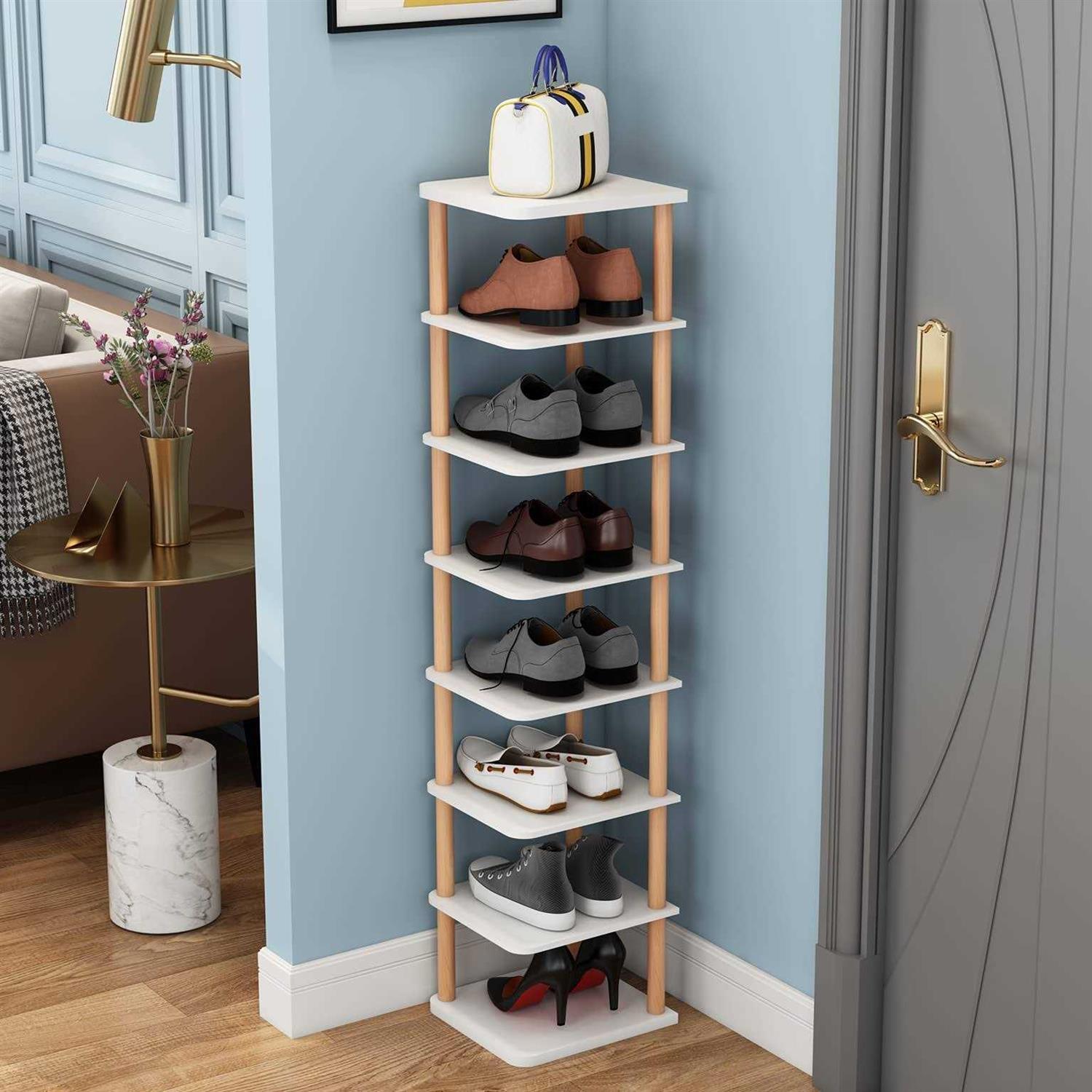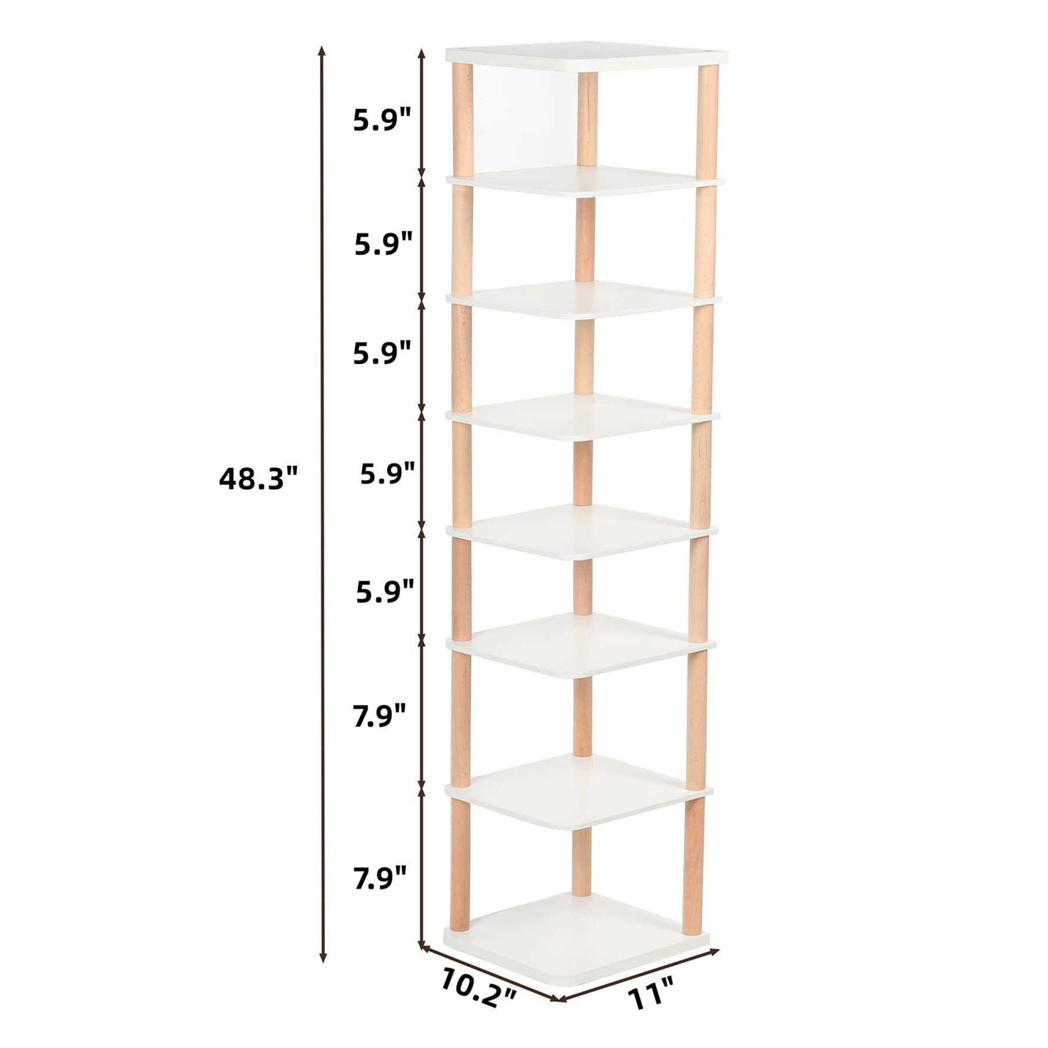 Lucknock 8 Tiers Vertical Shoe Rack, White, No-Tool Assembly, Narrow Shoe 8-TIER VERTICAL SHOE RACKThe 8 tier open shoe storage enable easy access and visibility for your shoes, keep your room neat and organized without occupying too much floor space. Put a pair of shoes per layer, helping to classify different types of shoes in daily needs. SPACE SAVING SHOE ORGANIZER Without occupying too much space, the dimension W 11″ x D 10.2″ x H 48.3″(28 x 26 x 123 cm) makes this shoe organizer an ideal storage solution for any narrow or tiny space, such as the closet, entryway, dormitory, bedroom, hallway, etc. MULTI-FUNCTIONAL STORAGE SHELF Functions as a shoe rack to provide storage space for shoes, boots, high heels, and sneakers. Performing well as a storage shelf or display rack to hold daily items, such as CDs, books, photo albums, plants, towels, small appliances, and more. STURDY WOODEN SHOE SHELFMade of E1-grade MDF and solid beech wood, this shoe shelf is much durable and sturdier to hold shoes and heavier item. Different from the rigid metal shoe racks and the fragile plastic shoe racks, this one is specially designed with a look of wood accent to be decorative enough to suit any corner of your house. Fit for varying shoe heightThe bottom two layers are 7.9″ high, which is perfect for high heels. Removing one board you will get a 15.7″ space for your high boots. The top 5 layers are 5.9″ high, making it well hold flat shoes, slippers, sneakers, etc. No-Tool AssemblyJust twist the wood rods on according to the instructions, you can finish it in 3 minutes.