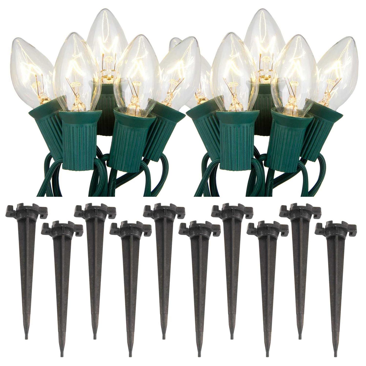 Electric pathway lights will create festive lighting for your special event. They are weather resistant so they can be enjoyed for many seasons. Simply stretch the 30-ft lights cord and position each of the light bulbs in each anchor stake. They are perfect for lining a driveway walkway sidewalk or entryway. 30 foot green cord with 10 C7-5 watt clear bulbs energy efficient. 10 Green Light Holder Stakes. 120 volt UL approved Bulbs – 3000 hours nickel base. 36″ spacing between bulbs Cords features end to end connectors and have 5amp fused plugs Indoor and outdoor weather fade and peel resistant30 foot green cord with 10 C7-5 watt clear bulbs energy efficient. 10 Green Light Holder Stakes. Cords features end to end connectors and have 5amp fused plugs. Weather resistant. Reusable. UL listed Bulbs – 3000 hours nickel base. 36″ spacing between bulbs.