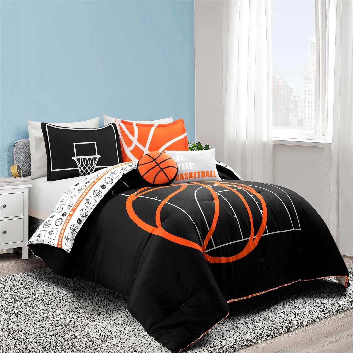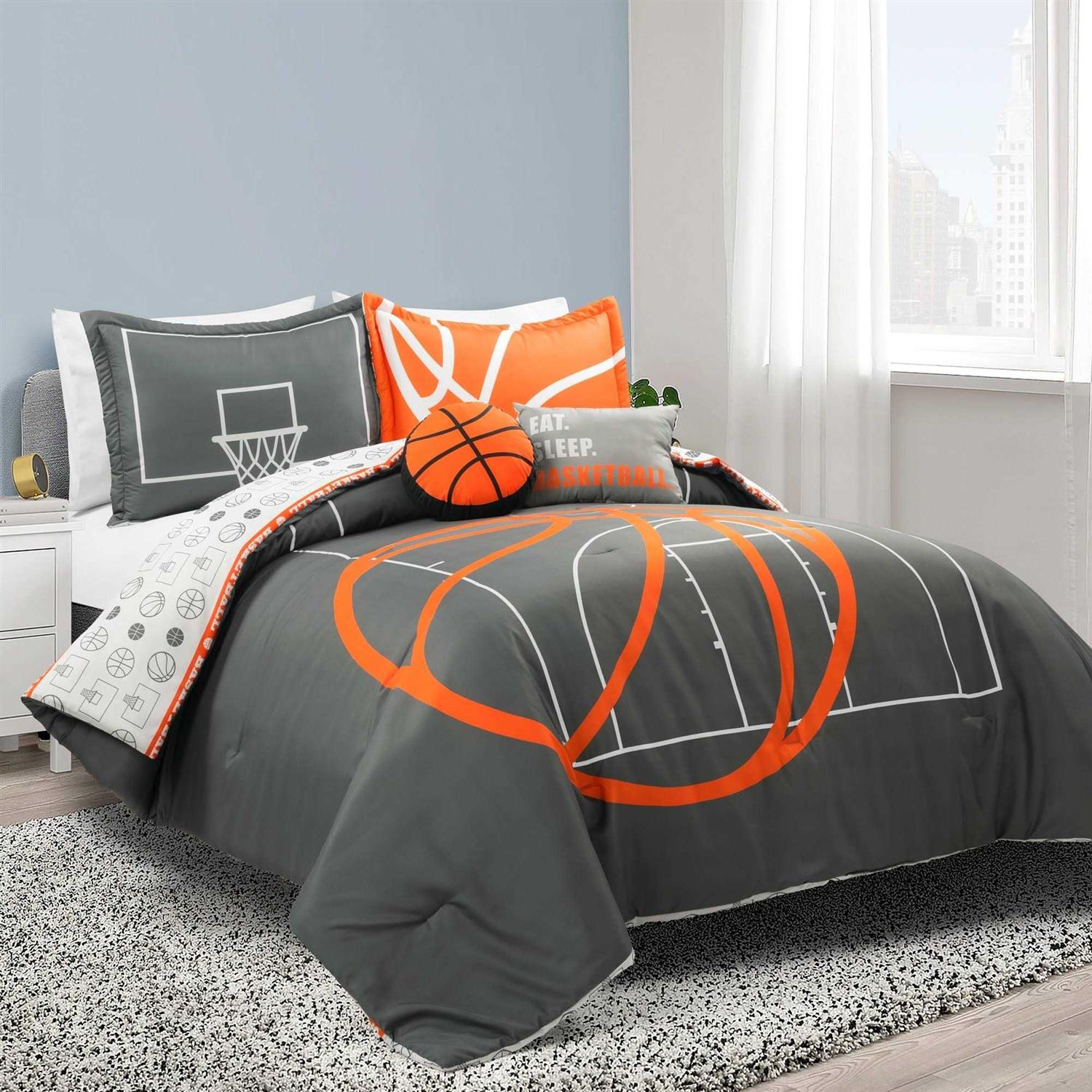 Never leave the court far behind when you decorate your basketball star’s bedroom with this cozy comforter set. Star players need to rest, too. Celebrate your child’s favorite sport with this basketball court bedding set. The bold print is perfect for true fans of the game, as well as general sports-inspired bedroom themes. (Twin includes 1 sham) Celebrate your child’s favorite sport with this basketball court bedding set. The bold print is perfect for true fans of the game, as well as general sports-inspired bedroom themes. Conveniently, the quilt and shams are machine washable. The decorative pillows should be spot cleaned. Please refer to the product labels for full care instructions. Full/Queen Comforter measures 90 inches wide x 90 inches long. Twin Comforter Measures 86 inches long x 68 inches wide. Please refer to the label for full care instructions.