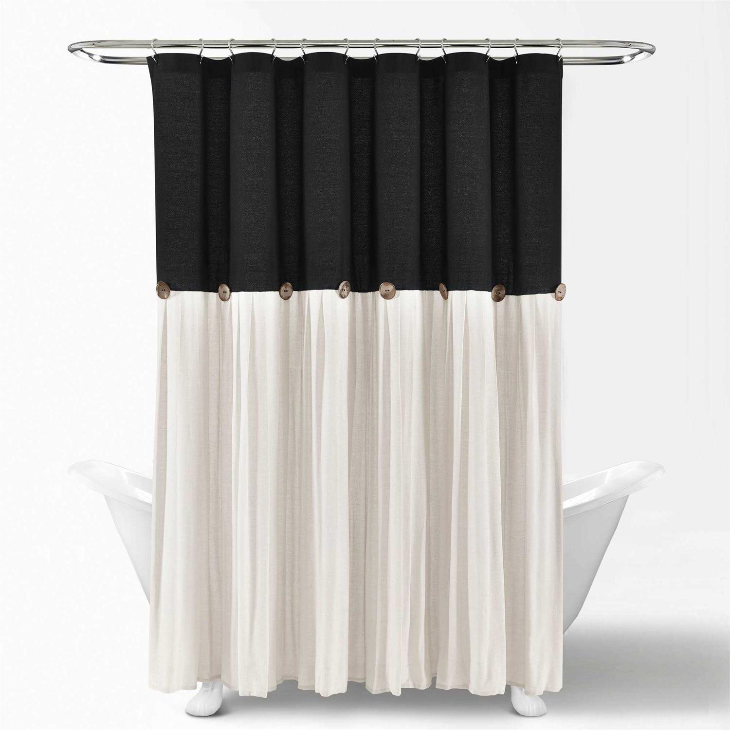 Add a fun energy to your bathroom with Lush Decor’s delightful Linen Button Shower Curtain. The trendy button embellishments add a unique touch to the look of your space. The pleats in the cotton/linen blend fabric give this Linen Button Shower Curtain a more textured look. The slight weave variations are authentic to this natural fiber blend and create a relaxed look. This Linen Button Shower Curtain is ideal for your guest bath master bathroom or teen’s bathroom. The large selection of colors makes it easy to match any space. The Linen Button Shower Curtain is 72 inches on each side. It hangs easily with any standard shower curtain rings or hooks. You may have to use two for a claw foot tub. For your convenience this Linen Button Shower Curtain is safe to machine wash and tumble dry.