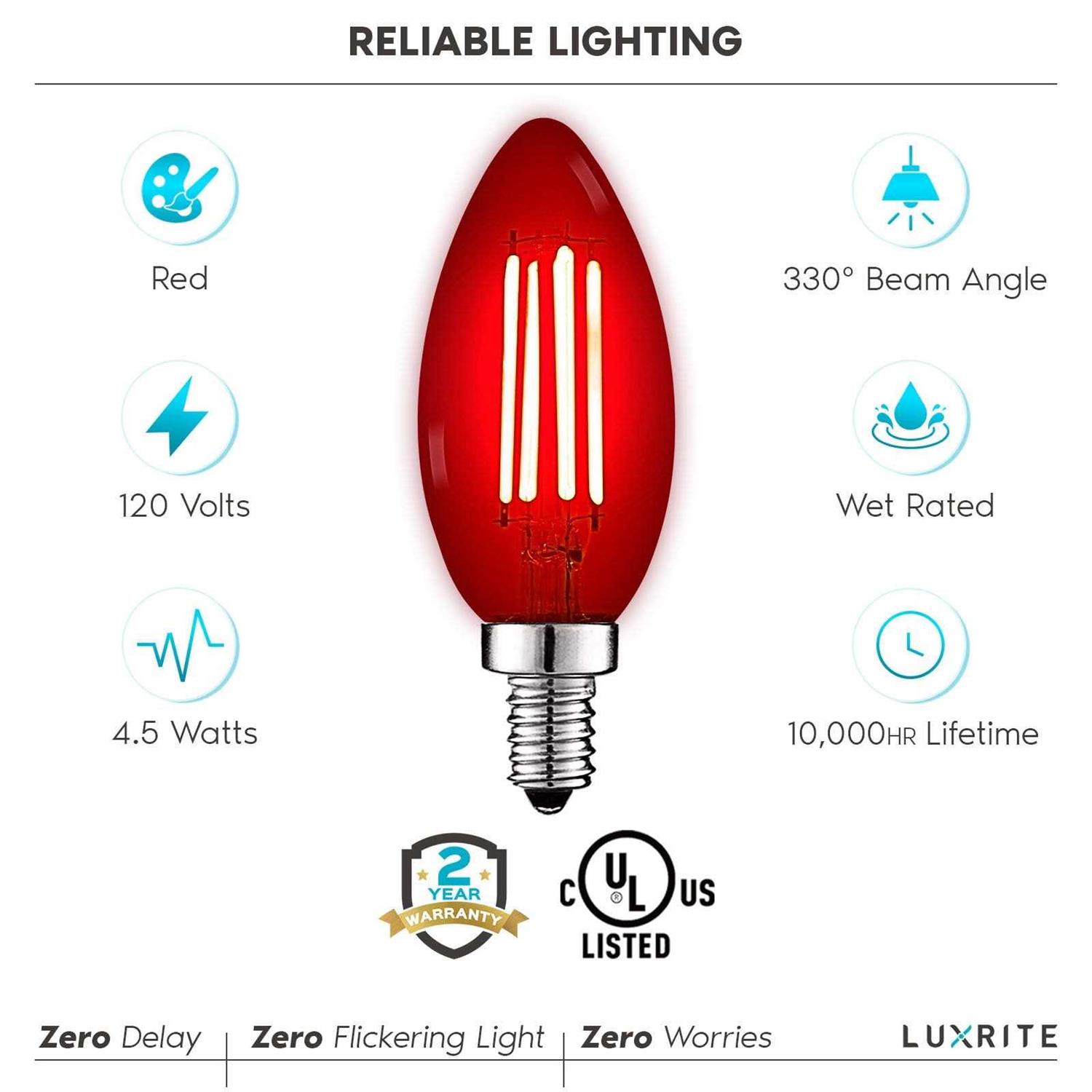 Luxrite Candelabra Edison LED Colored Light Bulbs – Express yourself with these clear glass colored LED bulbs that will brighten your space with vivid color that you will enjoy. Available in a variety of colors, so you can mix and match other colored bulbs together for a unique twist to your space. Each light bulb is equivalent to a 40 watt incandescent but only uses 4.5 watts of power, which means not only will you get to enjoy a colorful space but you will also save energy while doing it. With it’s wet location rating, you’ll be able to use these in almost any location without issue. Along with it’s energy savings, these will also last 6 times longer than traditional lights with it’s 10,000 hour lifetime. Built to last, you can use these lights year after year and not have to think about getting replacements. Zero flickering light, zero delay, and zero worry with Luxrite color light bulbs that are UL listed for your safety.
