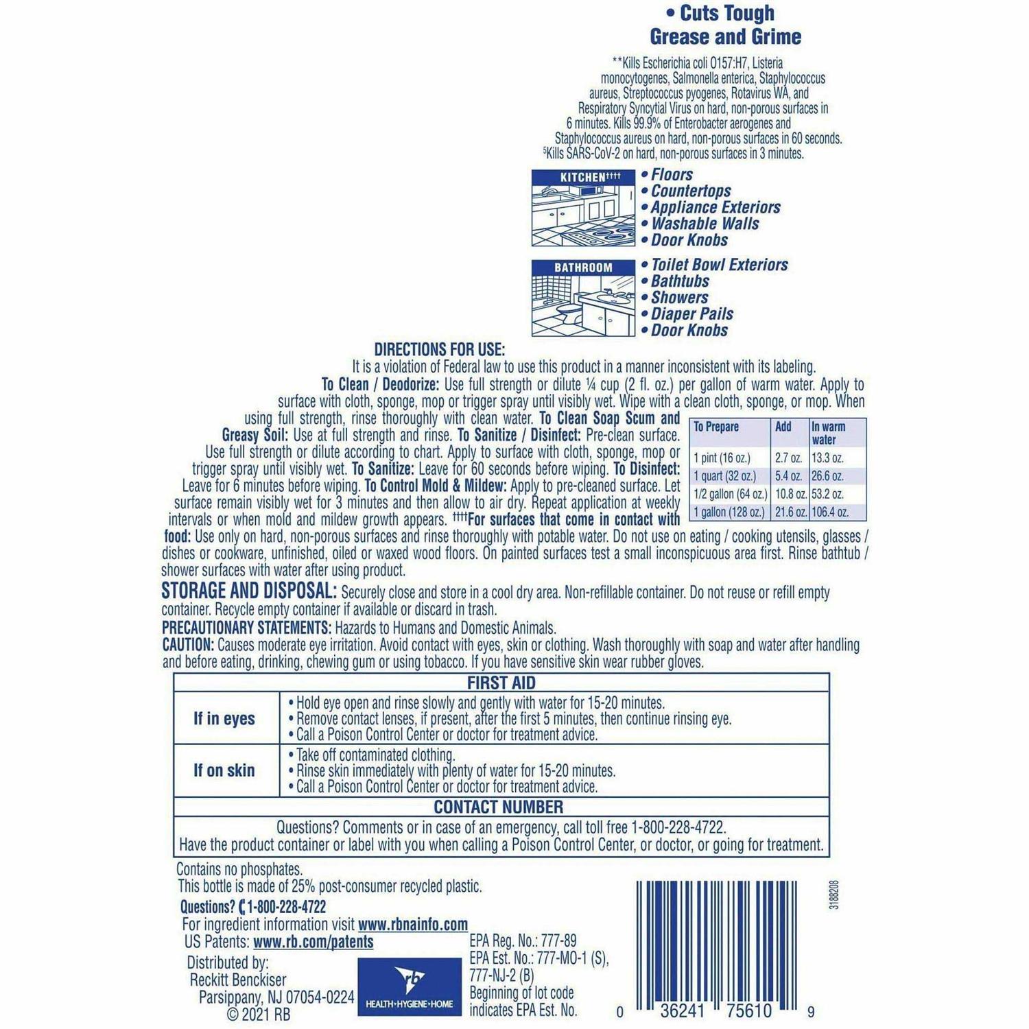 Approved to kill germs and odor-causing bacteria even when diluted. Kills 99.9 percent of viruses and bacteria on hard, non-porous surfaces when used as directed. Cuts through tough grease and grime. For use on floors, countertops, washable walls, door knobs, showers, bathtubs, diaper pails, toilet bowl exteriors and appliance exteriors.