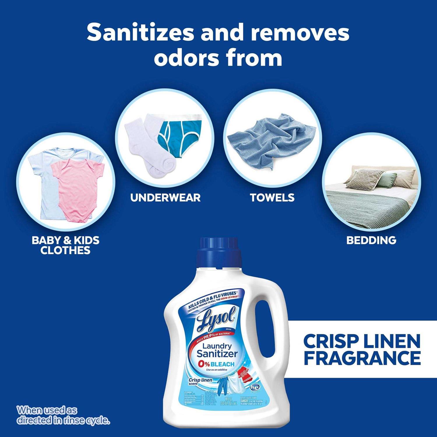 Lysol Brands 95872 Used as an additive, this laundry sanitizer kills 99.9 percent of the bacteria that detergents leave behind without the use of bleach to safely sanitize your clothes when you need it. Versatile formula works in cold water and is suitable to use with both whites and colors. Laundry sanitizer is perfect for eliminating bacteria that can cause illnesses and create lingering odors from clothes, beddings, towels, sportswear, delicates and more. Laundry sanitizer is designed for standard and HE machines.