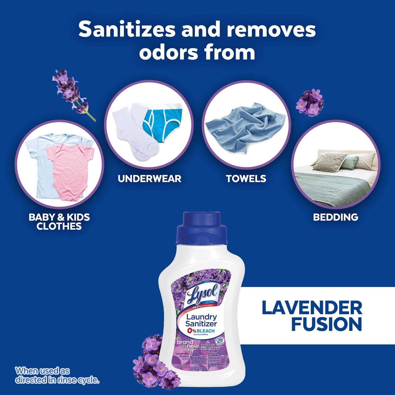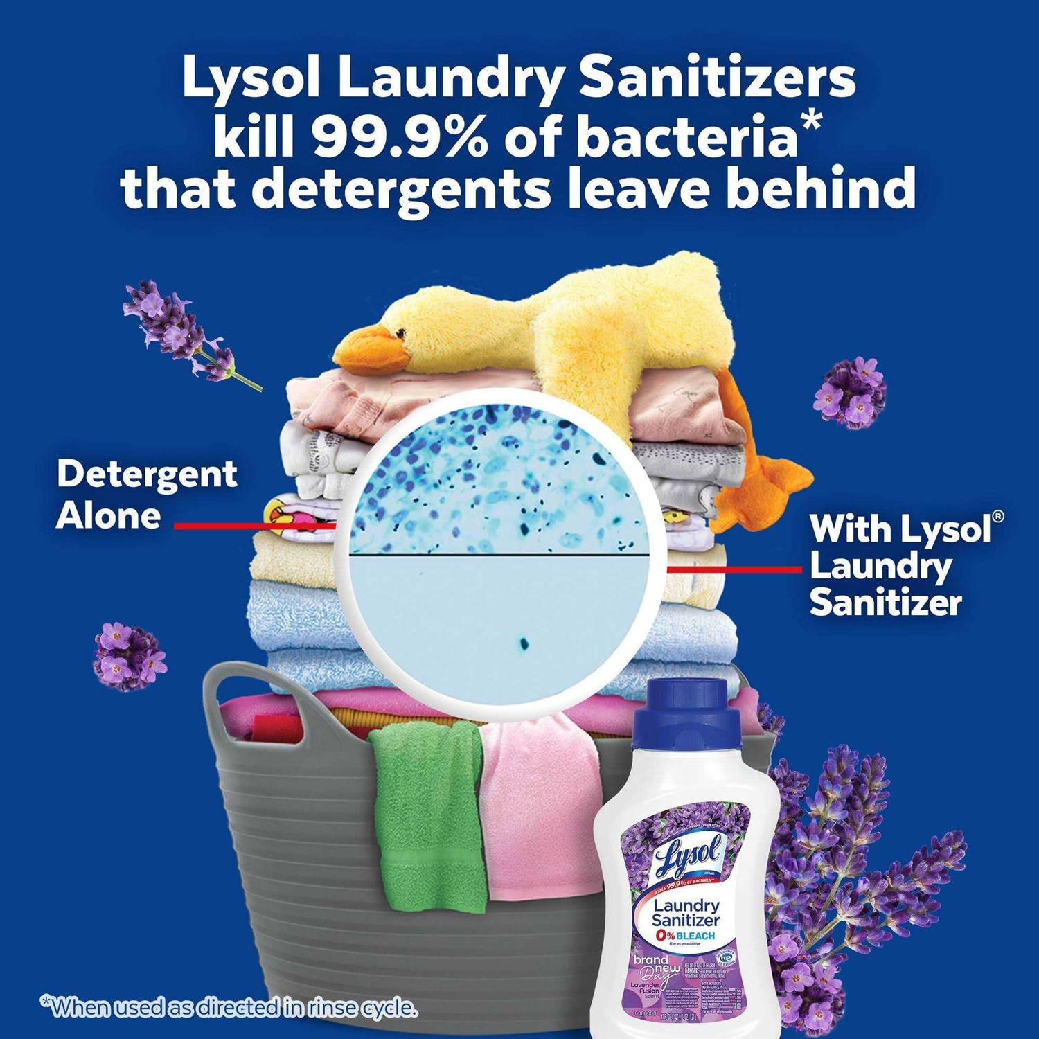 Our clothes are in constant contact with bacteria throughout our day-to-day activities, for example through contact with contaminated surfaces, other people and our own bodies. Bacteria can spread from one fabric to another in the laundry basket, from the washing-machine drum to the next load. Some these bacteria can survive a wash cycle and can cause potential infection risk with pathogenic bacteria. When it comes to certain laundry loads such as children’s clothes or sportswear, you want your detergent to eliminate bacteria that can cause illnesses and create lingering bad smells. But detergents alone don’t actually kill all bacteria. Introducing Lysol Laundry Sanitizer, an additive specially designed to kill 99.9percent of bacteria left behind. Simply add Lysol Laundry Sanitizer to your rinse cycle. It does not contain any bleach and even works in cold water so is safe to use on most fabrics including whites, colors and darks.