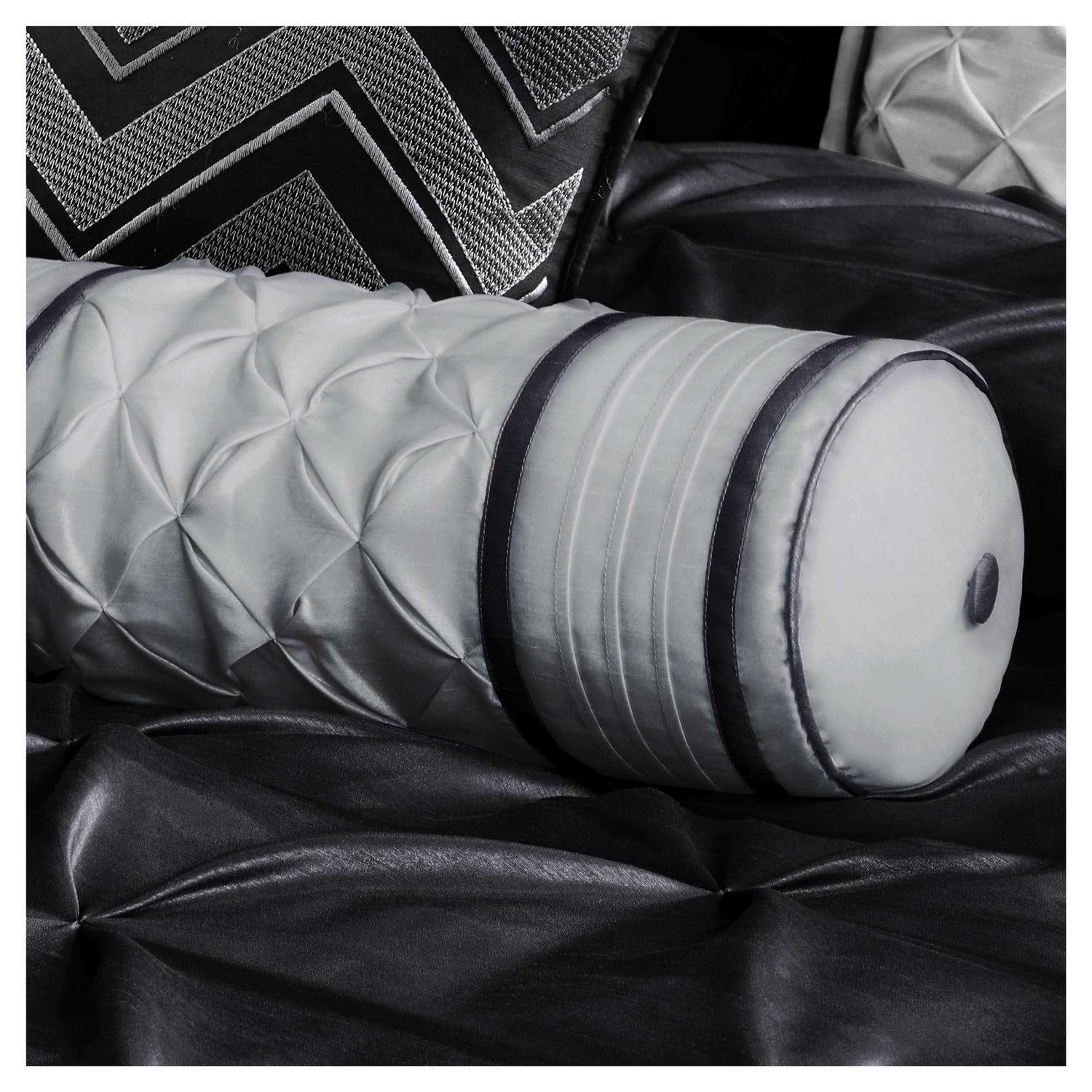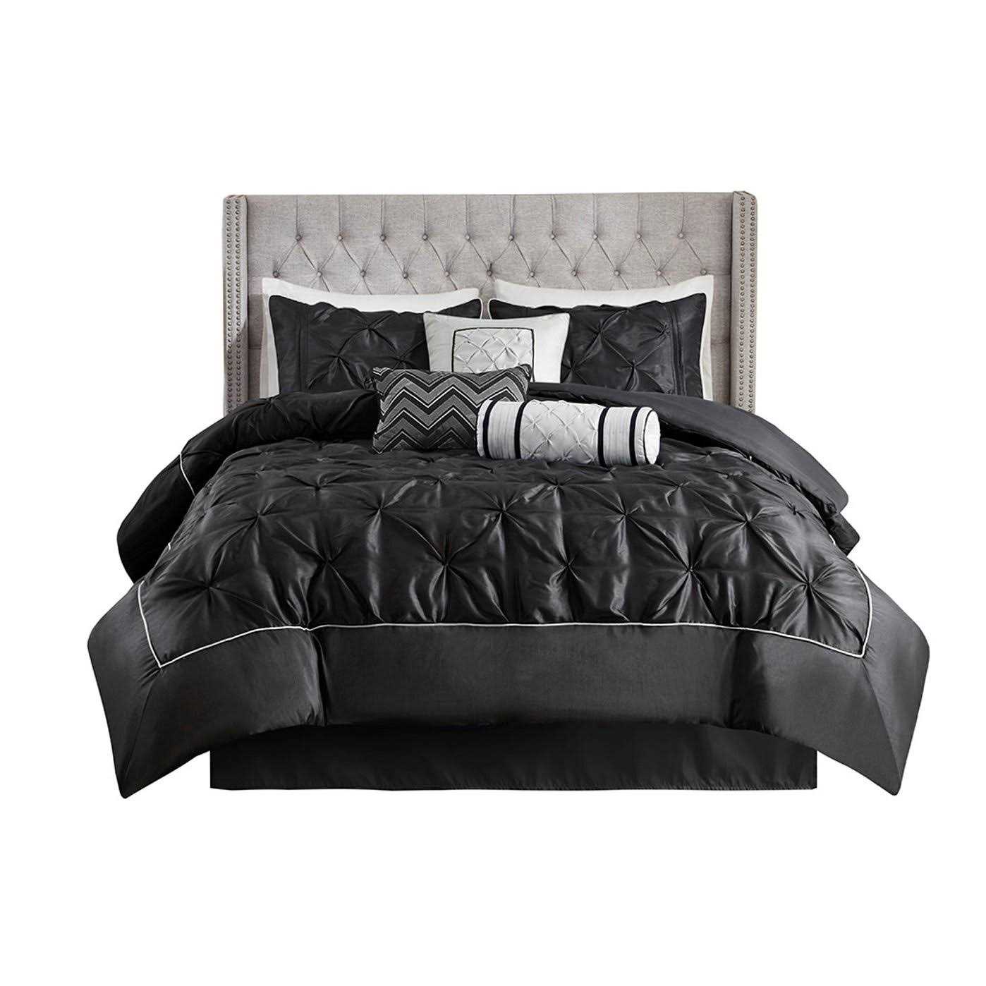 Its gorgeous, true black color makes this set easy to accessorize your bedroom. The collection is made from 100% polyester polyoni and has pieced fabric sewn together to give this set dimension. It is finished with a smooth edge of fabric that creates a beautiful border around this comforter. Items in the set may come in a rolled or compressed packaging, which will need to be fluffed up or steam ironed before use to remove wrinkles.