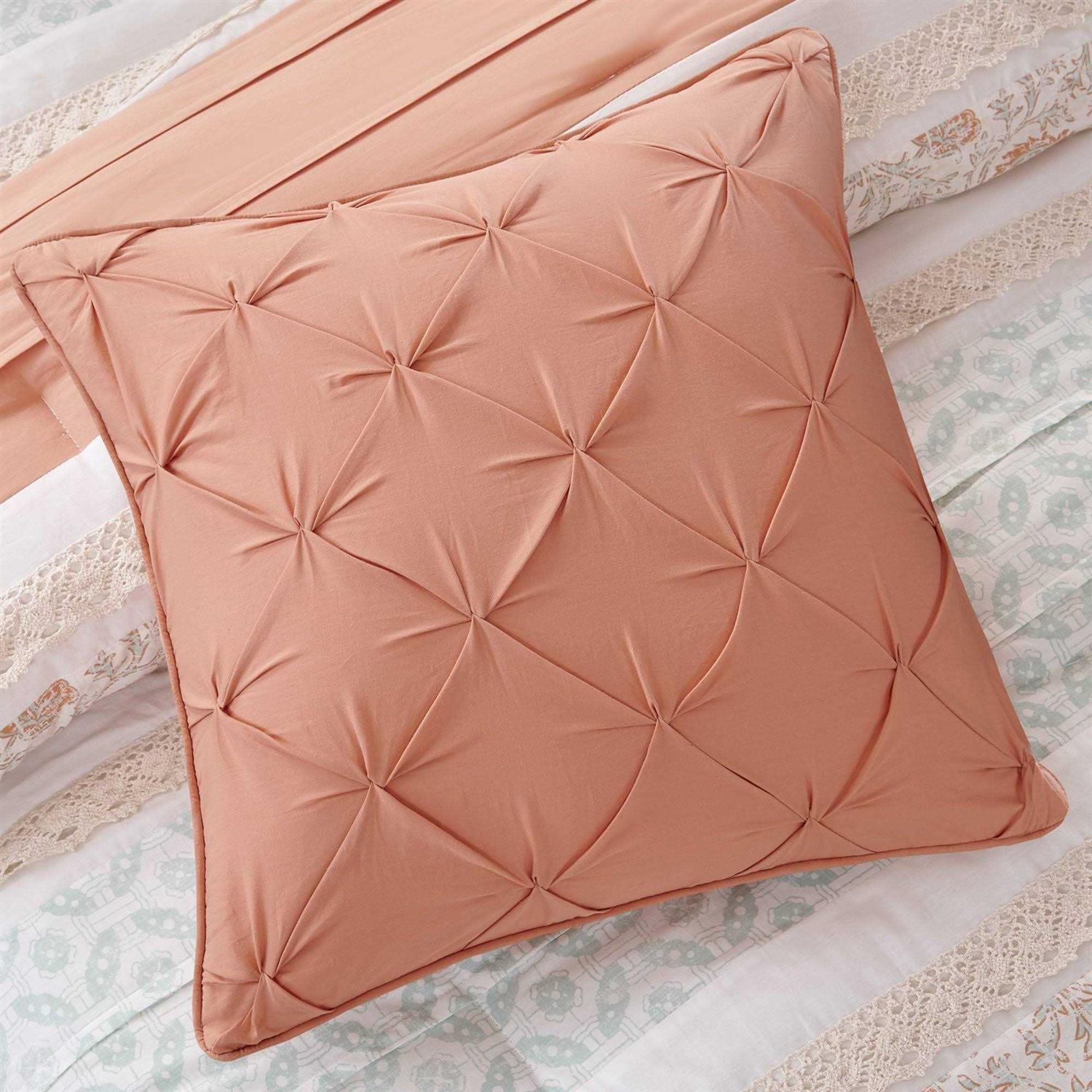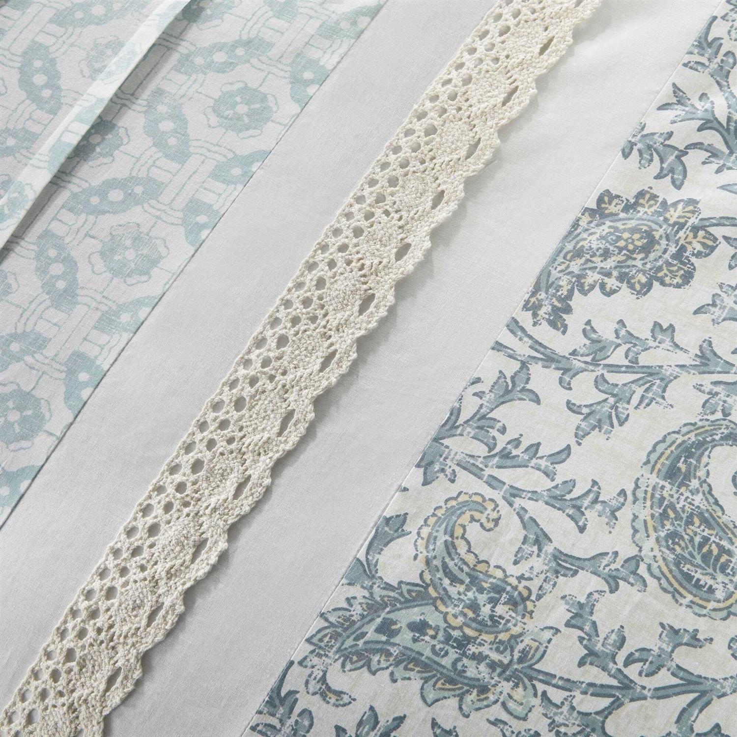 The Madison Park Dawn 9 Piece Cotton Percale Comforter Set offers a shabby chic update to your bedroom decor. A paisley print is featured on the cotton comforter with pin tucked fabric separated by lace taping embellishments. Around the edge, a ruched flange adds a graceful touch, for a charming cottage look. Matching shams mirror the design of the comforter, while two solid Euro shams complement the top of the bed. Three decorative pillows and a solid bed skirt complete this farmhouse comforter set. This bedding set is also Oeko-Tex certified, meaning it does not contain any harmful substances or chemicals to ensure quality comfort and wellness. A coordinating shower curtain is available and sold separately.