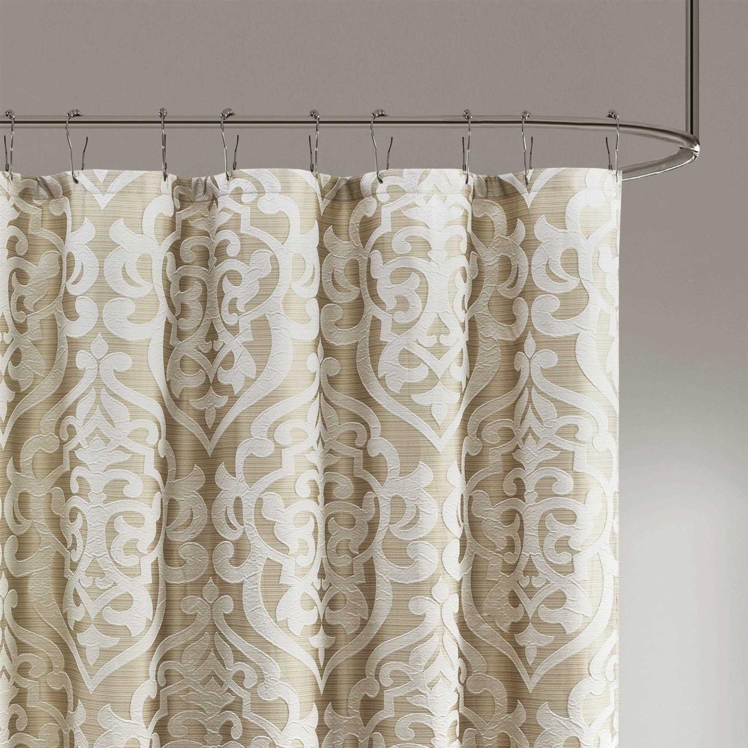 Add a touch of class to your bathroom with our Madison Park Odette Jacquard Shower Curtain. This luxurious textured shower curtain flaunts a gorgeous ivory damask medallion design on a stria tan jacquard ground that adds rich texture and dimension to the lavish look. Measuring 72×72 inch, each shower curtain is finished with 12 button holes on top making it easy to assemble hooks and hang onto rod (hooks and rod not included). To better preserve this beautiful shower curtain, a water repellant liner is highly recommended and can be purchased separately (liner not included). Machine washable for easy care.