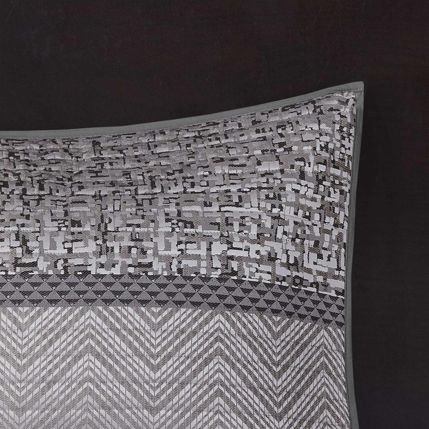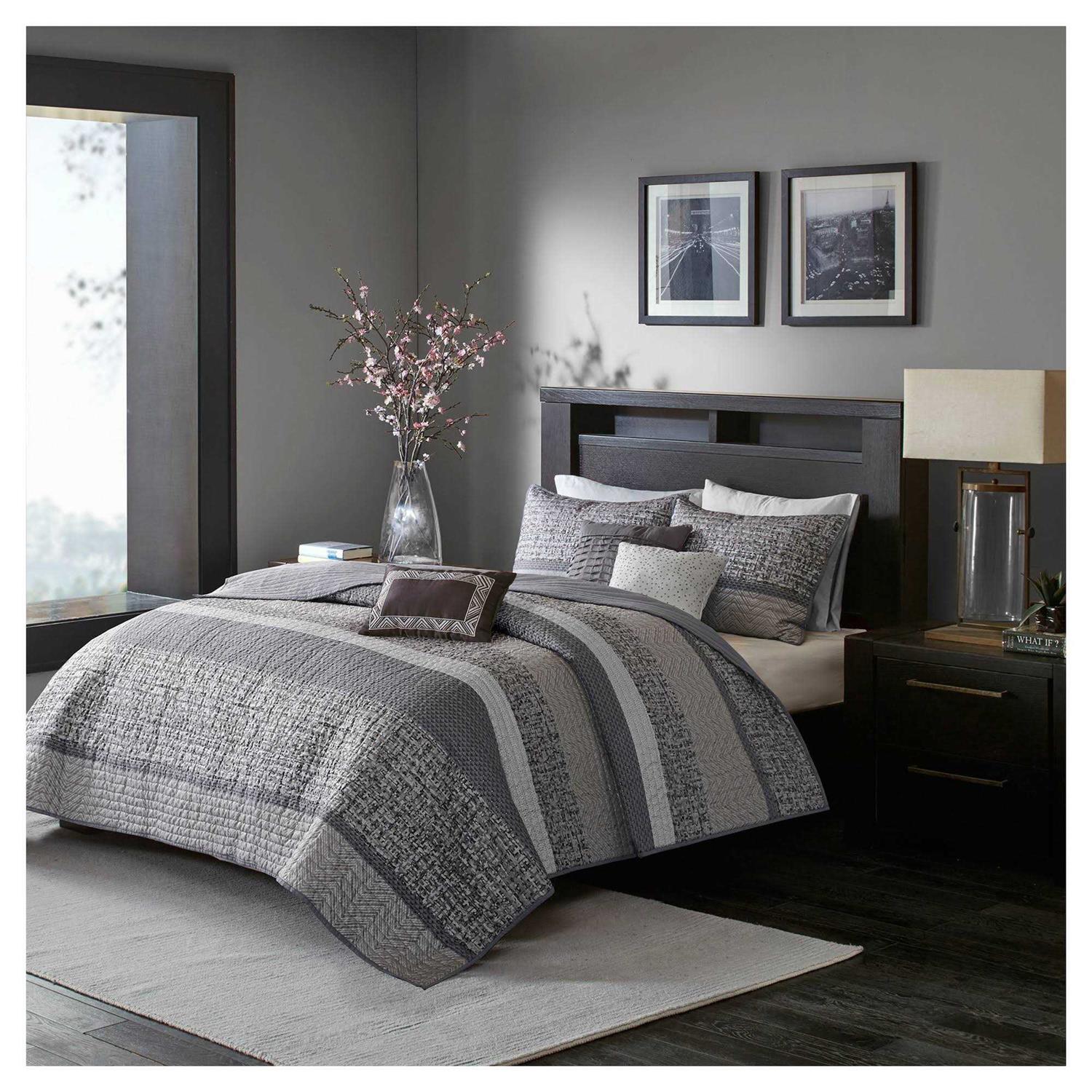 The dimensional aspect of linear striping offers an upscale look to a master or guest suite. From the Melody collection by Madison Park, this six-piece modern reversible coverlet set features a striking gray and taupe pattern with striping of variable widths. Accenting coordinating elements are fashioned carefully to compose an entire picture. Set includes reversible coverlet, two print shams, and three coordinating accent pillows.