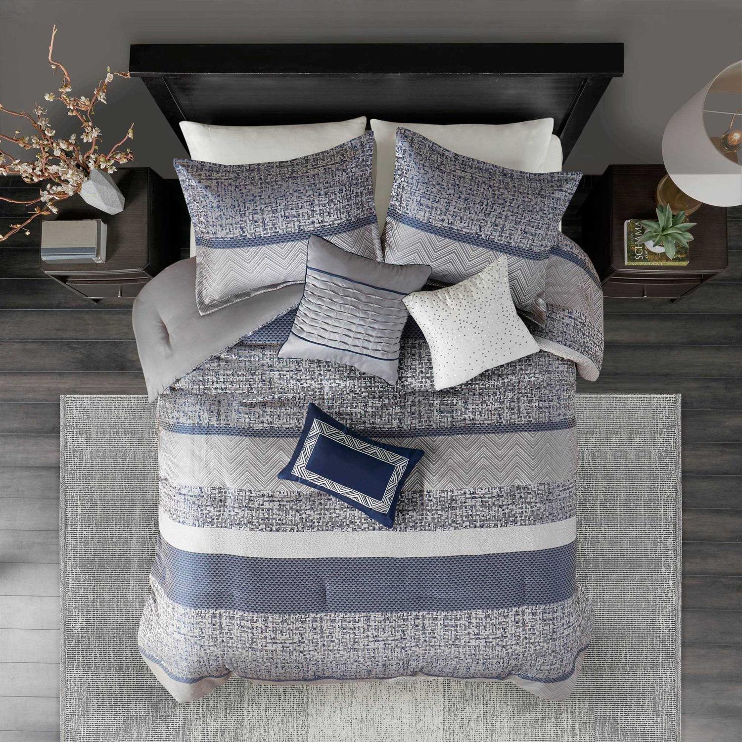 Give your bedroom a new luxurious look with the Harmony 7 Piece Jacquard Comforter Set. This jacquard comforter features a navy and gray stripe design of several different motifs on the face with a solid gray reverse, for a chic transitional look. The 2 matching shams complement the design of the comforter to complete this glam comforter set. Also included is a solid navy bed skirt and 3 decorative pillows with embroidery and pleated details provide the finishing touches. Machine washable for easy care, this jacquard comforter set brings a sophisticated update to your bedroom decor.