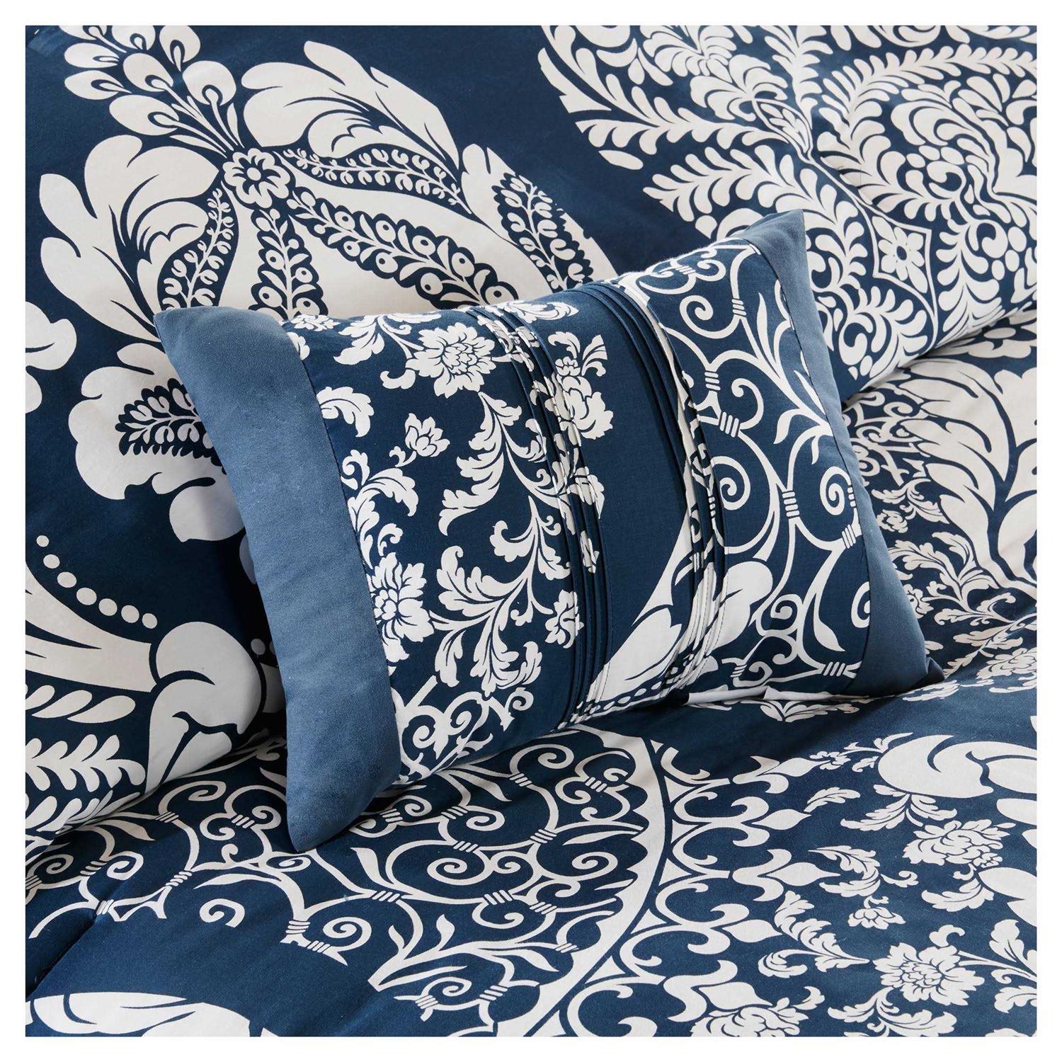 Stunningly elegant, the Madison Park Vienna 7 Piece Comforter Set offers an eye-catching update to your bedroom decor. A beautifully intricate damask pattern, in indigo and white hues, is flaunted across the comforter for a chic transitional look. A solid indigo reverse perfectly complements the top of the bed, while the flange border adds a charming accent to the comforter. Two coordinating shams mirror the look of the comforter and feature an added flange border accent. To complete the bedding set, three decorative pillows with embroidered details and fabric manipulation are included. Made from 100% cotton sateen, this comforter set is machine washable and gives your bedroom a lavish allure.