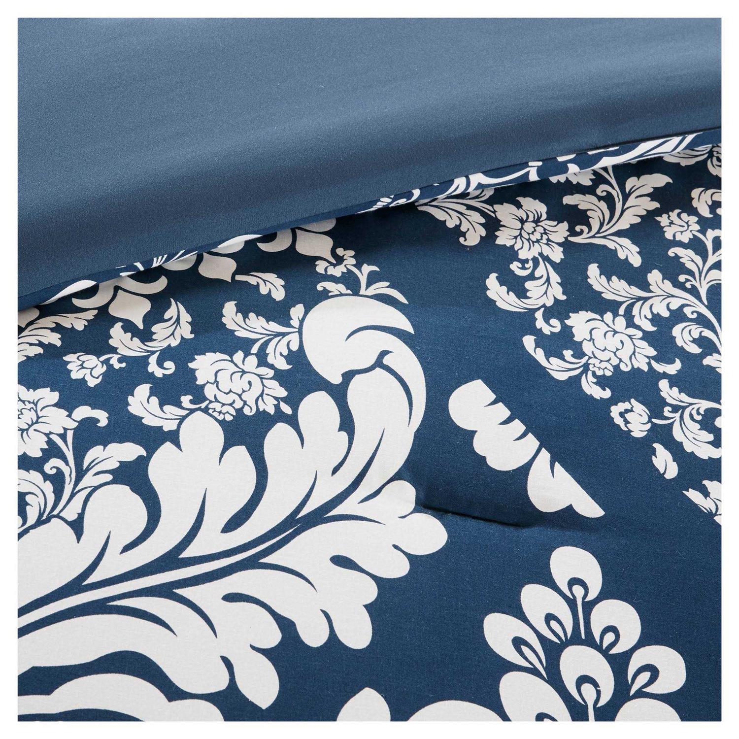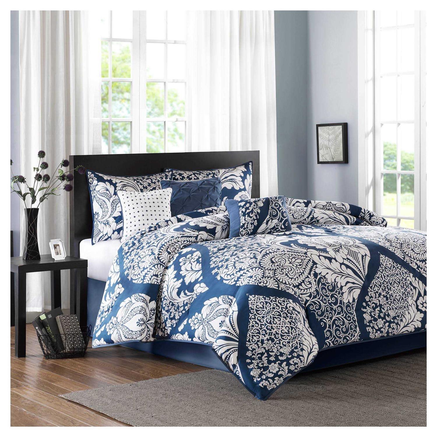 Stunningly elegant, the Madison Park Vienna 7 Piece Comforter Set offers an eye-catching update to your bedroom decor. A beautifully intricate damask pattern, in indigo and white hues, is flaunted across the comforter for a chic transitional look. A solid indigo reverse perfectly complements the top of the bed, while the flange border adds a charming accent to the comforter. Two coordinating shams mirror the look of the comforter and feature an added flange border accent. To complete the bedding set, three decorative pillows with embroidered details and fabric manipulation are included. Made from 100% cotton sateen, this comforter set is machine washable and gives your bedroom a lavish allure.
